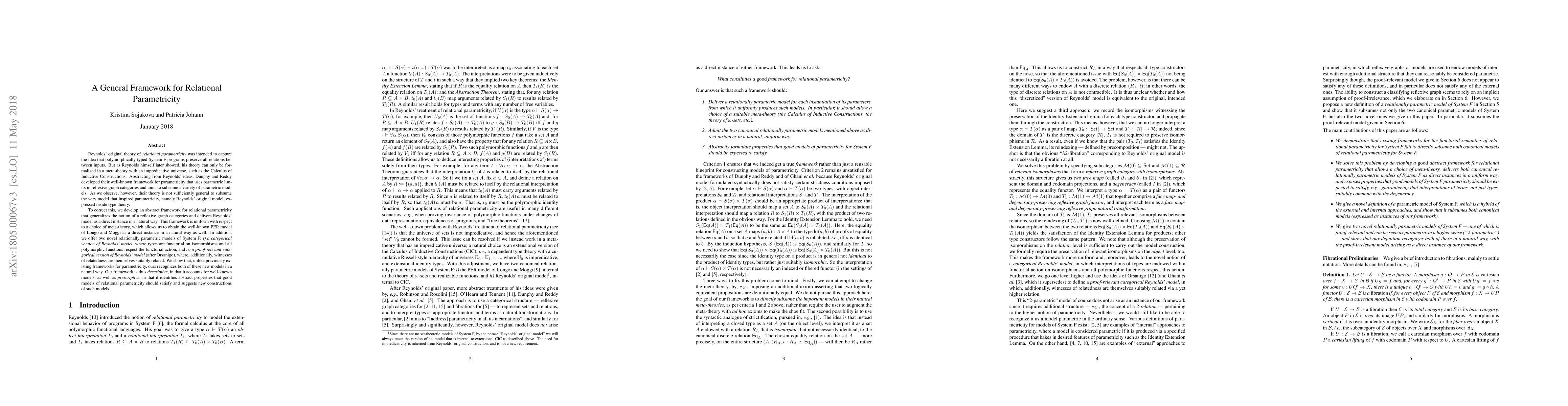 Reynolds' original theory of relational parametricity was intended to capture the idea that polymorphically typed System F programs preserve all relations between inputs. But as Reynolds himself later showed, his theory can only be formalized in a meta-theory with an impredicative universe, such as the Calculus of Inductive Constructions. Abstracting from Reynolds' ideas, Dunphy and Reddy developed their well-known framework for parametricity that uses parametric limits in reflexive graph categories and aims to subsume a variety of parametric models. As we observe, however, their theory is not sufficiently general to subsume the very model that inspired parametricity, namely Reynolds' original model, expressed inside type theory. To correct this, we develop an abstract framework for relational parametricity that generalizes the notion of a reflexive graph categories and delivers Reynolds' model as a direct instance in a natural way. This framework is uniform with respect to a choice of meta-theory, which allows us to obtain the well-known PER model of Longo and Moggi as a direct instance in a natural way as well. In addition, we offer two novel relationally parametric models of System F: i) a categorical version of Reynolds' model, where types are functorial on isomorphisms and all polymorphic functions respect the functorial action, and ii) a proof-relevant categorical version of Reynolds' model (after Orsanigo), where, additionally, witnesses of relatedness are themselves suitably related. We show that, unlike previously existing frameworks for parametricity, ours recognizes both of these new models in a natural way. Our framework is thus descriptive, in that it accounts for well-known models, as well as prescriptive, in that it identifies abstract properties that good models of relational parametricity should satisfy and suggests new constructions of such models.