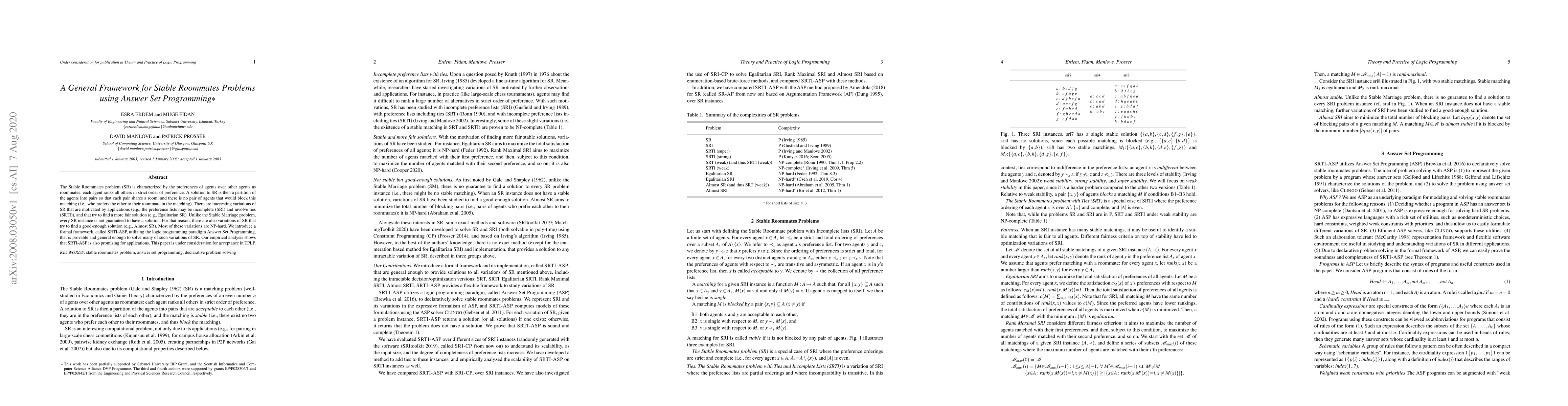 The Stable Roommates problem (SR) is characterized by the preferences of agents over other agents as roommates: each agent ranks all others in strict order of preference. A solution to SR is then a partition of the agents into pairs so that each pair shares a room, and there is no pair of agents that would block this matching (i.e., who prefers the other to their roommate in the matching). There are interesting variations of SR that are motivated by applications (e.g., the preference lists may be incomplete (SRI) and involve ties (SRTI)), and that try to find a more fair solution (e.g., Egalitarian SR). Unlike the Stable Marriage problem, every SR instance is not guaranteed to have a solution. For that reason, there are also variations of SR that try to find a good-enough solution (e.g., Almost SR). Most of these variations are NP-hard. We introduce a formal framework, called SRTI-ASP, utilizing the logic programming paradigm Answer Set Programming, that is provable and general enough to solve many of such variations of SR. Our empirical analysis shows that SRTI-ASP is also promising for applications. This paper is under consideration for acceptance in TPLP.