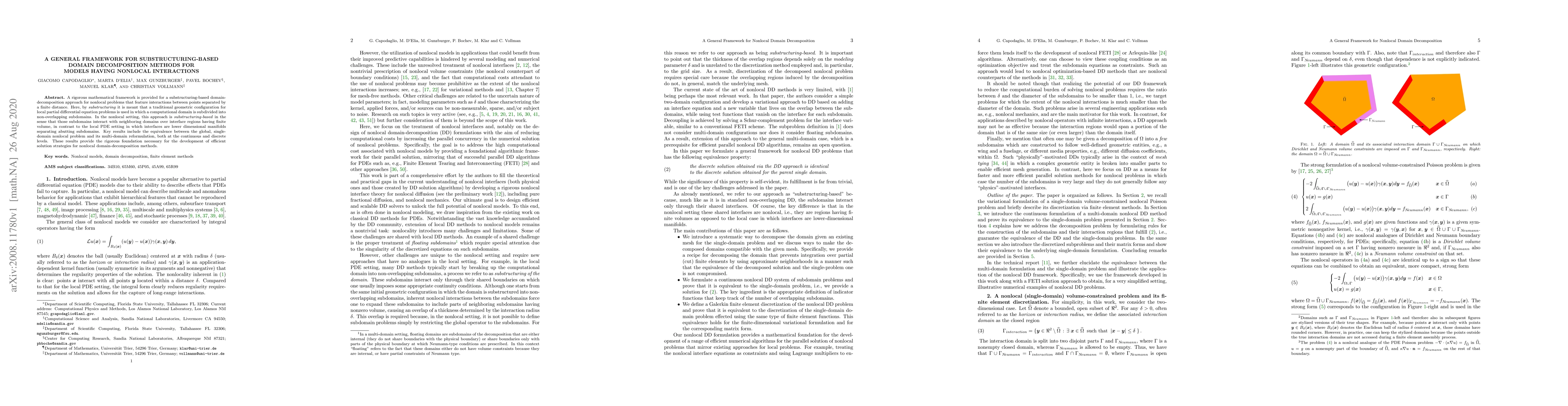 This paper presents a rigorous mathematical framework for substructuring-based domain decomposition methods for nonlocal problems, emphasizing interactions between distant points. It establishes equivalence between global and multi-domain formulations, providing a foundation for efficient solution strategies.