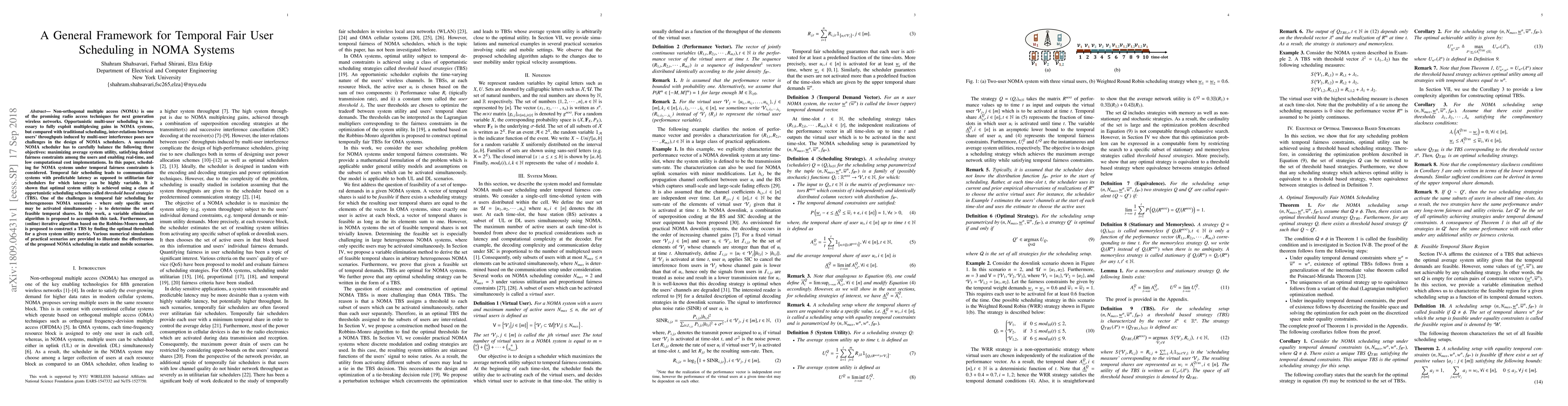 This paper proposes a general framework for temporal fair user scheduling in NOMA systems, focusing on balancing system utility, user fairness, and computational efficiency. It introduces a variable elimination algorithm to determine feasible temporal shares and an iterative method to construct threshold-based scheduling schemes for optimal performance, validated through simulations in both static and mobile environments.