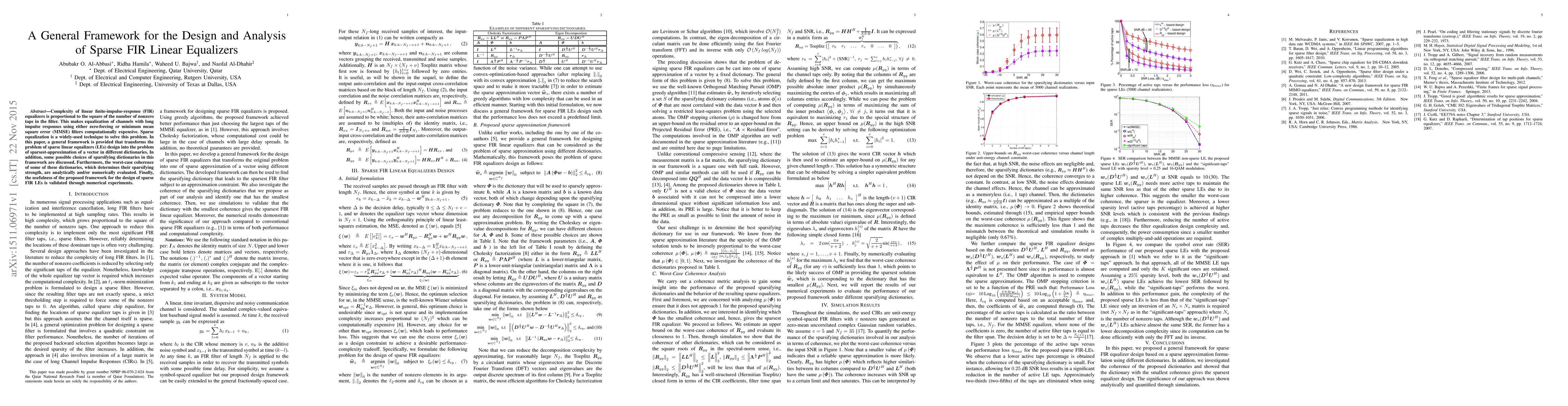 This paper presents a general framework for designing and analyzing sparse linear finite-impulse-response (FIR) equalizers, transforming the problem into one of sparsest-approximation in various dictionaries. The framework's effectiveness is validated through numerical experiments and analysis of the dictionaries' coherence.