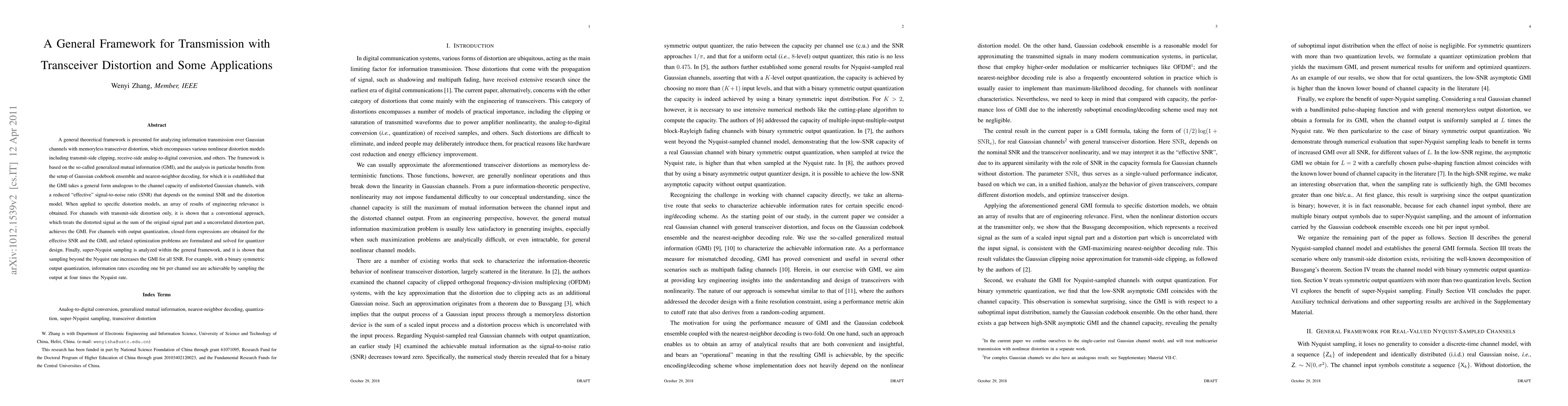 A general theoretical framework is presented for analyzing information transmission over Gaussian channels with memoryless transceiver distortion, which encompasses various nonlinear distortion models including transmit-side clipping, receive-side analog-to-digital conversion, and others. The framework is based on the so-called generalized mutual information (GMI), and the analysis in particular benefits from the setup of Gaussian codebook ensemble and nearest-neighbor decoding, for which it is established that the GMI takes a general form analogous to the channel capacity of undistorted Gaussian channels, with a reduced "effective" signal-to-noise ratio (SNR) that depends on the nominal SNR and the distortion model. When applied to specific distortion models, an array of results of engineering relevance is obtained. For channels with transmit-side distortion only, it is shown that a conventional approach, which treats the distorted signal as the sum of the original signal part and a uncorrelated distortion part, achieves the GMI. For channels with output quantization, closed-form expressions are obtained for the effective SNR and the GMI, and related optimization problems are formulated and solved for quantizer design. Finally, super-Nyquist sampling is analyzed within the general framework, and it is shown that sampling beyond the Nyquist rate increases the GMI for all SNR. For example, with a binary symmetric output quantization, information rates exceeding one bit per channel use are achievable by sampling the output at four times the Nyquist rate.