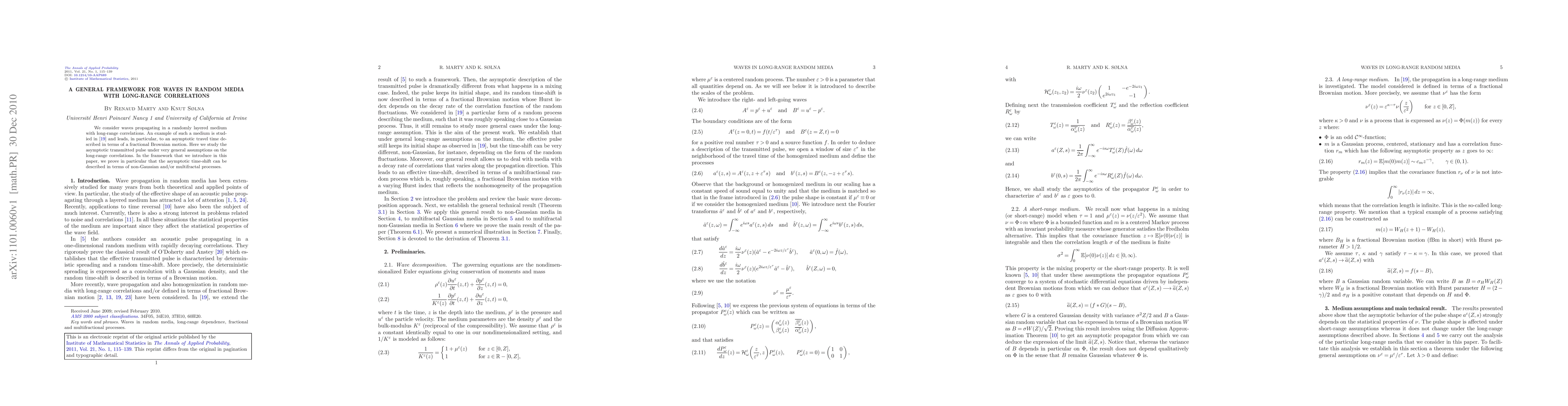 This paper presents a general framework for understanding wave propagation in random media with long-range correlations, such as layered structures. It proves that the asymptotic time-shift in these media can be described using non-Gaussian and/or multifractal processes, extending previous findings on fractional Brownian motion.
