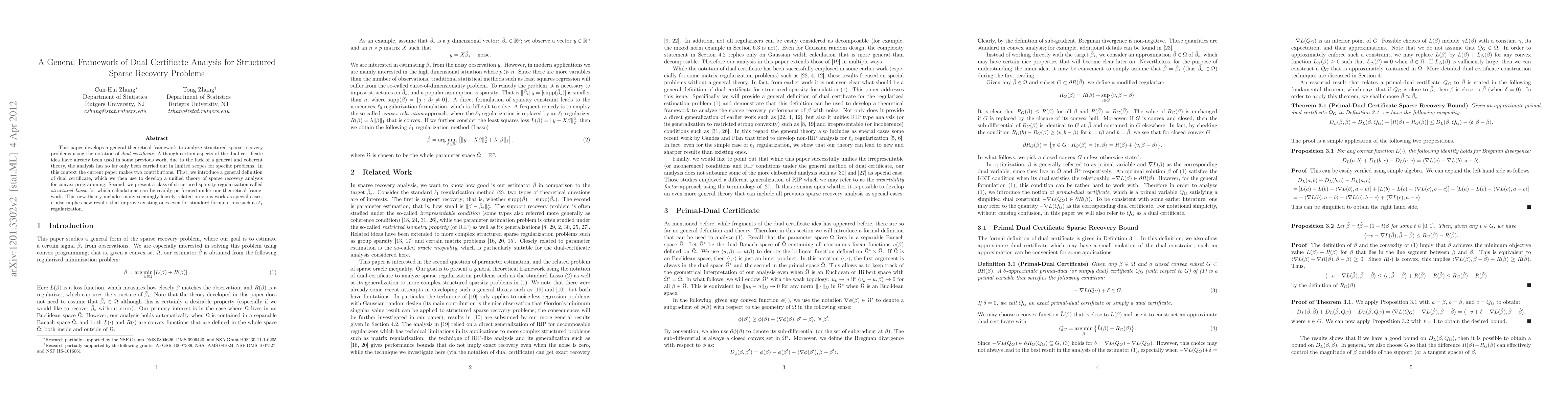 This paper presents a general theoretical framework for analyzing structured sparse recovery problems using dual certificates. It introduces a unified theory for sparse recovery via convex programming and applies it to a new structured sparsity regularization method called structured Lasso.
