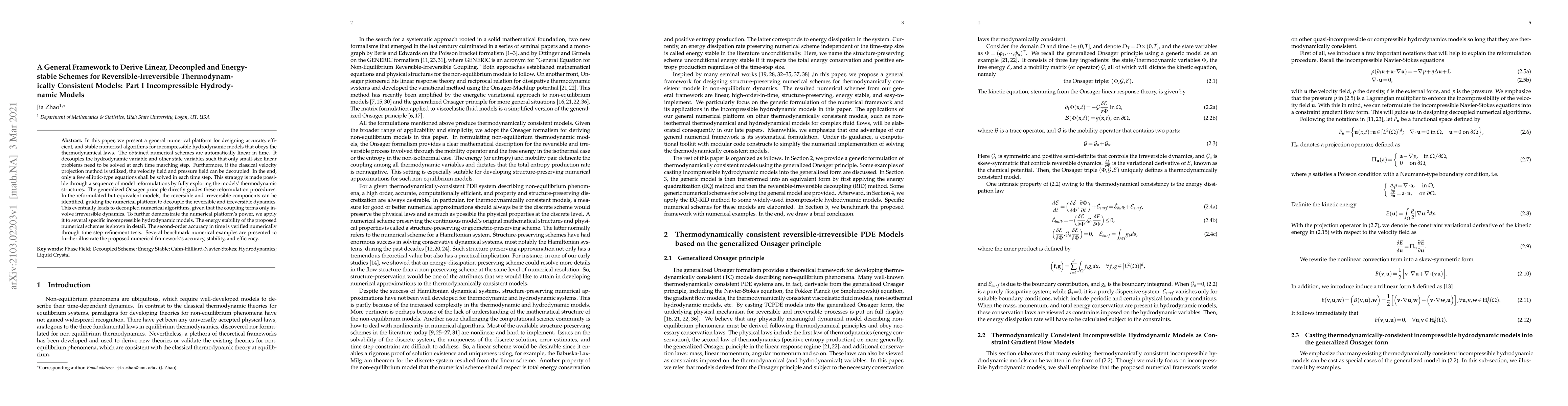 This paper introduces a numerical framework for designing stable, efficient algorithms for incompressible hydrodynamic models, ensuring thermodynamic consistency. The proposed schemes are linear, decoupled, and energy-stable, solving only small-size linear problems at each step. The framework leverages the Onsager principle to reformulate models, separating reversible and irreversible dynamics for improved decoupling.