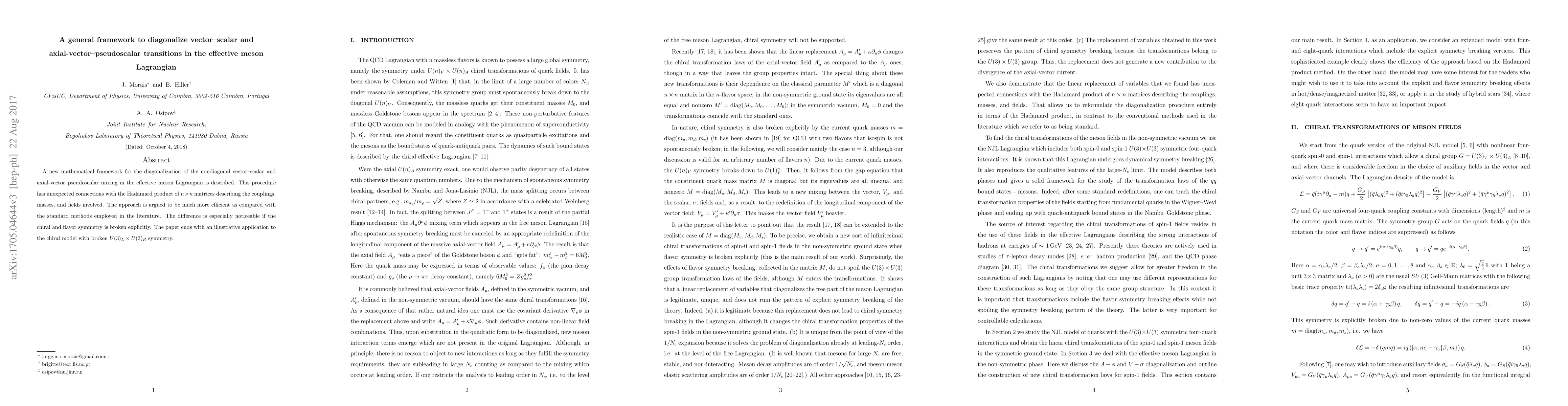 A new mathematical framework for the diagonalization of the nondiagonal vector--scalar and axial-vector--pseudoscalar mixing in the effective meson Lagrangian is described. This procedure has unexpected connections with the Hadamard product of $n\times n$ matrices describing the couplings, masses, and fields involved. The approach is shown to be much more efficient as compared with the standard methods employed previously. The difference is especially noticeable if the chiral symmetry is broken explicitly. The paper ends with an illustrative application to the chiral model with broken $SU(3)_L\times SU(3)_R$ symmetry.