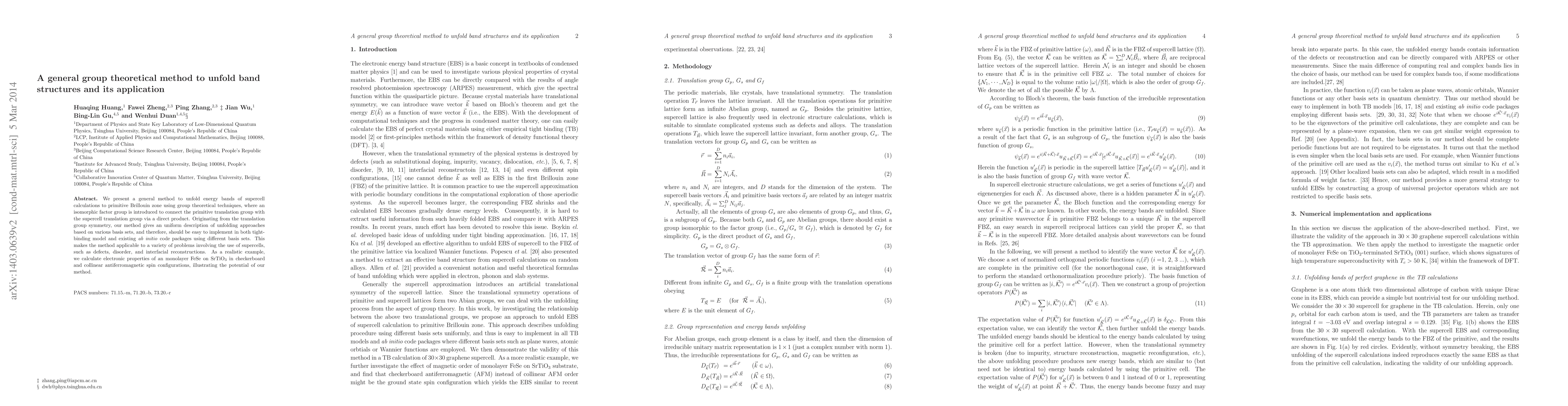 We present a general method to unfold energy bands of supercell calculations to primitive Brillouin zone using group theoretical techniques, where an isomorphic factor group is introduced to connect the primitive translation group with the supercell translation group via a direct product. Originating from the translation group symmetry, our method gives an uniform description of unfolding approaches based on various basis sets, and therefore, should be easy to implement in both tight-binding model and existing ab initio code packages using different basis sets. This makes the method applicable to a variety of problems involving the use of supercells, such as defects, disorder, and interfacial reconstructions. As a realistic example, we calculate electronic properties of an monolayer FeSe on SrTiO$_3$ in checkerboard and collinear antiferromagnetic spin configurations, illustrating the potential of our method.