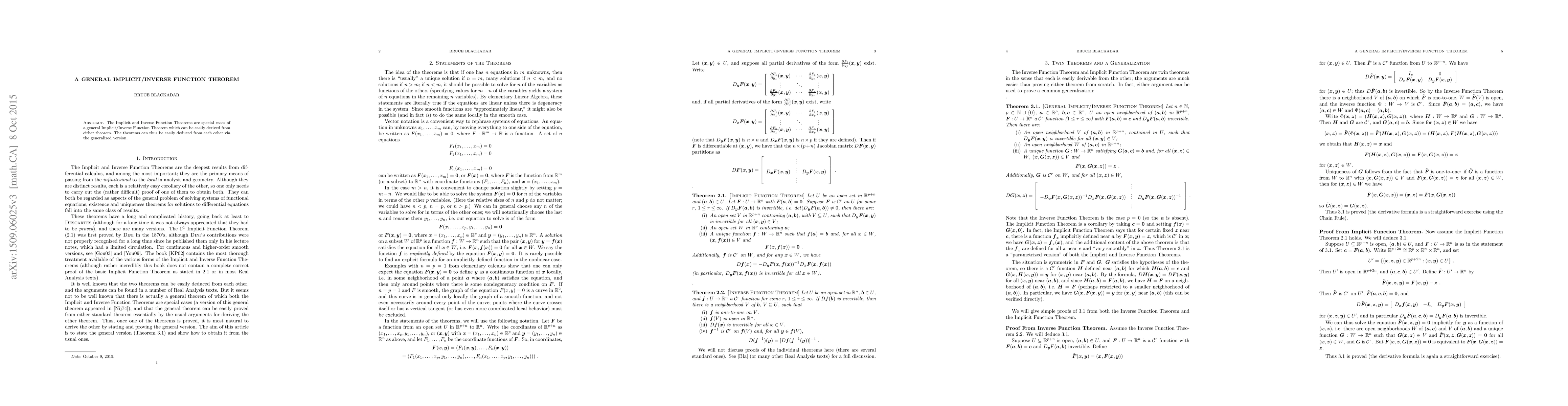 The paper presents a generalization of the Implicit and Inverse Function Theorems, derived from each other via a common generalized version.
