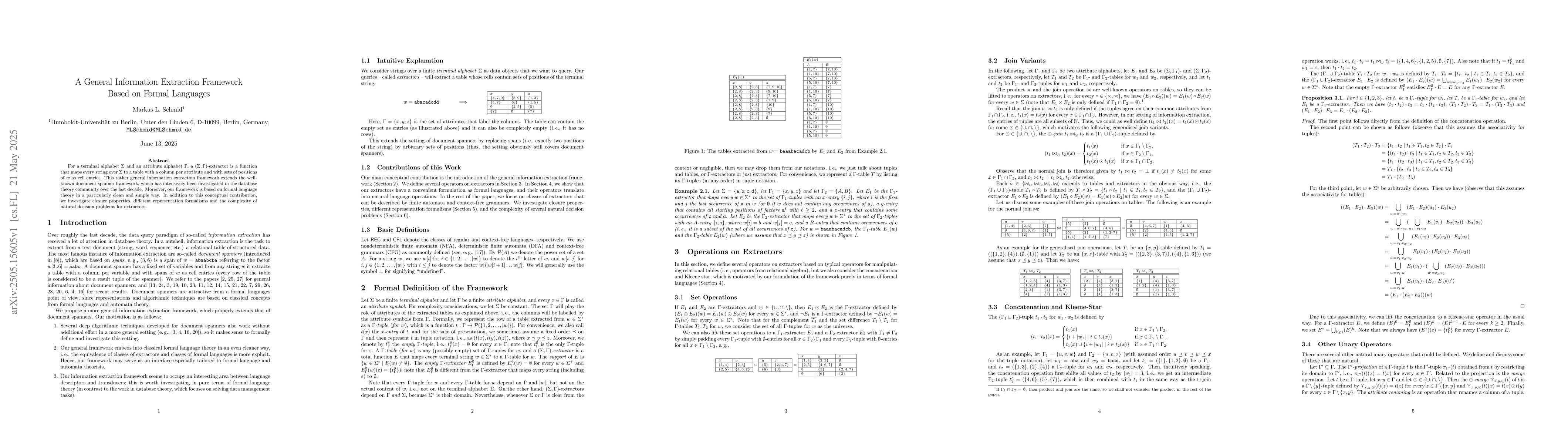 The paper introduces a general information extraction framework based on formal languages, defining a (Σ, Γ)-extractor as a function mapping strings over Σ to tables with columns for attributes and sets of positions of w as cell entries, extending the document spanner framework from database theory.