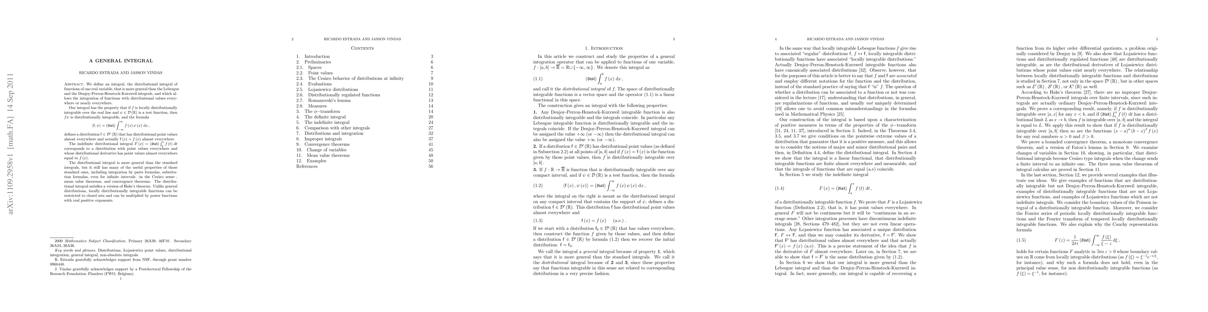 This paper introduces a general distributional integral that extends beyond the Lebesgue and Henstock-Kurzweil integrals, enabling the integration of functions with distributional values. It retains many properties of standard integrals, including integration by parts and substitution, and allows for the multiplication of integrable functions by power functions.
