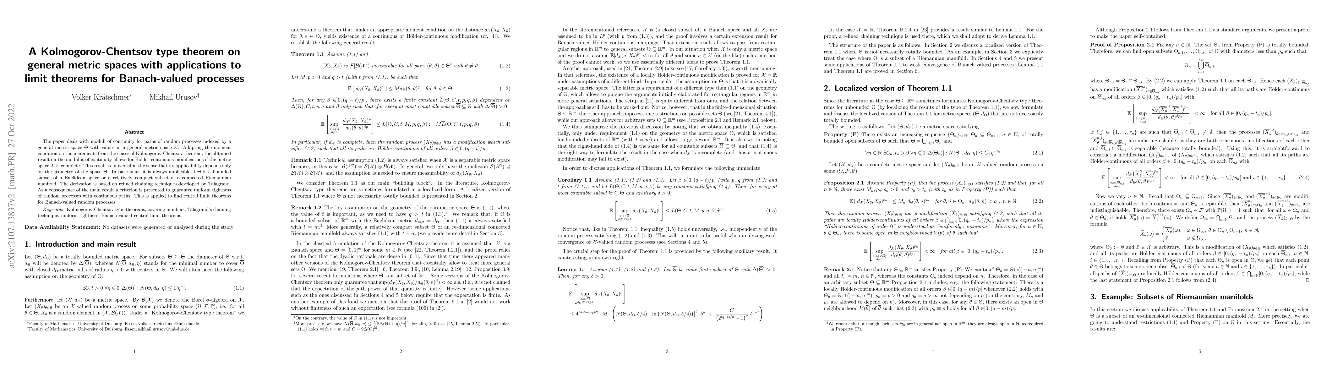 This paper establishes a generalized Kolmogorov-Chentsov theorem for random processes indexed by general metric spaces, allowing for H\"older-continuous modifications under completeness conditions. It applies to processes in Euclidean and Riemannian settings, and provides a criterion for uniform tightness and central limit theorems for Banach-valued processes.