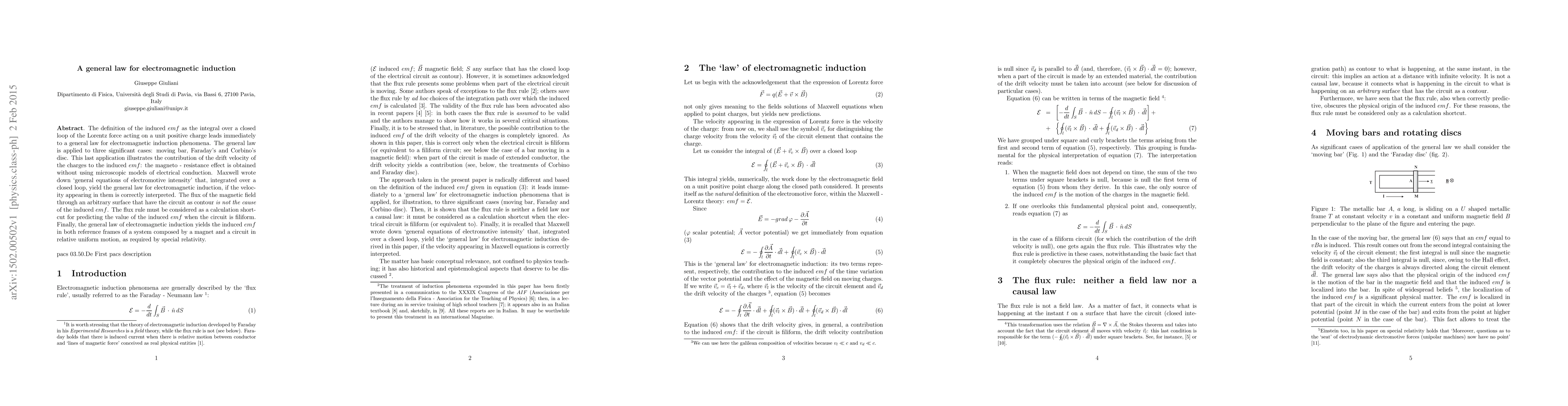 The definition of the induced $emf$ as the integral over a closed loop of the Lorentz force acting on a unit positive charge leads immediately to a general law for electromagnetic induction phenomena. The general law is applied to three significant cases: moving bar, Faraday's and Corbino's disc. This last application illustrates the contribution of the drift velocity of the charges to the induced $emf$: the magneto-resistance effect is obtained without using microscopic models of electrical conduction. Maxwell wrote down `general equations of electromotive intensity' that, integrated over a closed loop, yield the general law for electromagnetic induction, if the velocity appearing in them is correctly interpreted. The flux of the magnetic field through an arbitrary surface that have the circuit as contour {\em is not the cause} of the induced $emf$. The flux rule must be considered as a calculation shortcut for predicting the value of the induced $emf$ when the circuit is filiform. Finally, the general law of electromagnetic induction yields the induced $emf$ in both reference frames of a system composed by a magnet and a circuit in relative uniform motion, as required by special relativity.