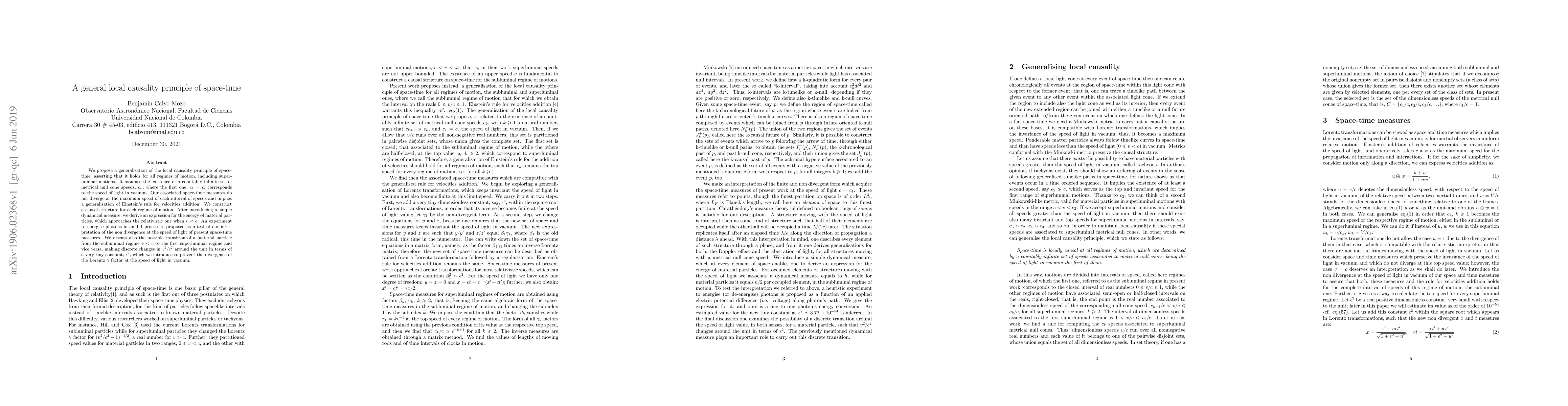 This paper proposes a generalized local causality principle of spacetime that includes superluminal motion, introducing a countably infinite set of null cone speeds. It presents a non-divergent space-time measure, a modified velocity addition rule, and an energy expression for particles approaching relativistic energy at subluminal speeds. The authors also suggest an experiment to test their interpretation and discuss potential transitions between subluminal and superluminal regimes with discrete changes in v^2/c^2, preventing Lorentz factor divergence at the speed of light.