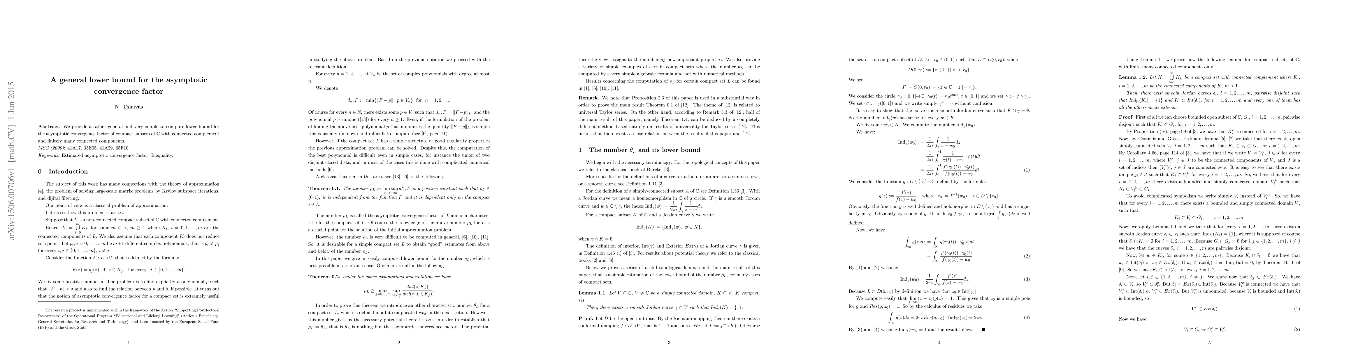 We provide a rather general and very simple to compute lower bound for the asymptotic convergence factor of compact subsets of the set of complex numbers with connected complement and finitely many connected components .