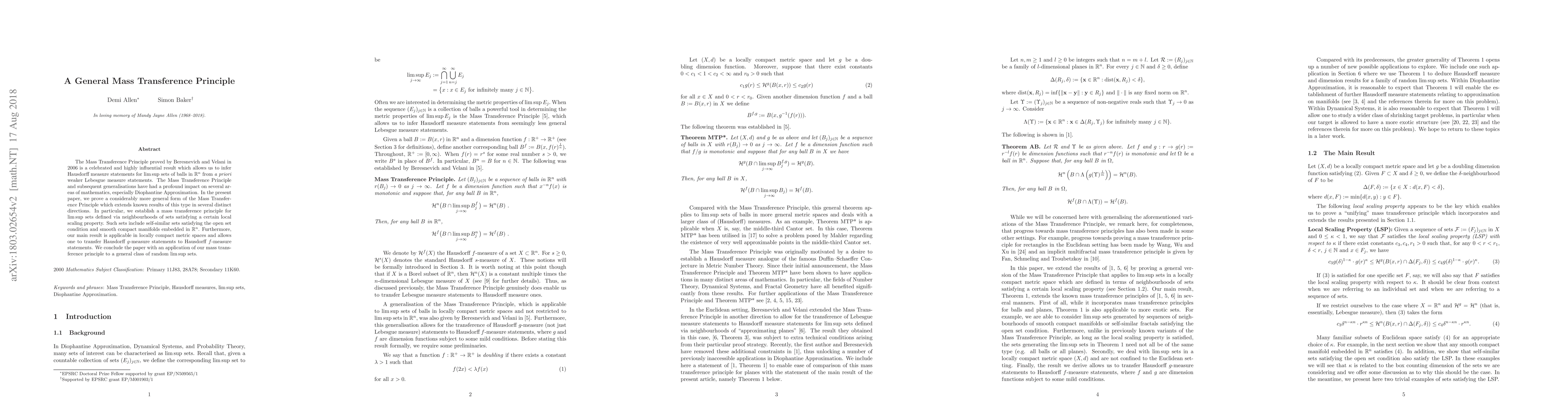 In this paper we prove a general form of the Mass Transference Principle for $\limsup$ sets defined via neighbourhoods of sets satisfying a certain local scaling property. Such sets include self-similar sets satisfying the open set condition and smooth compact manifolds embedded in $\mathbb{R}^n$. Our main result is applicable in locally compact metric spaces and allows one to transfer Hausdorff $g$-measure statements to Hausdorff $f$-measure statements. This work extends previous results of this type in several distinct directions.