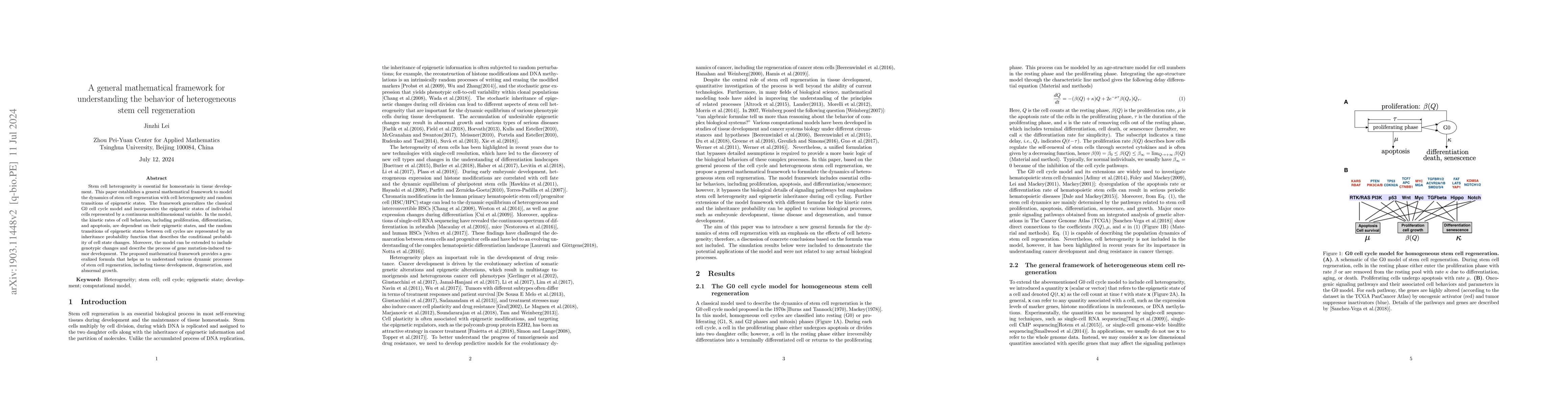 Stem cell heterogeneity is essential for the homeostasis in tissue development. This paper established a general formulation for understanding the dynamics of stem cell regeneration with cell heterogeneity and random transitions of epigenetic states. The model generalizes the classical G0 cell cycle model, and incorporates the epigenetic states of stem cells that are represented by a continuous multidimensional variable and the kinetic rates of cell behaviors, including proliferation, differentiation, and apoptosis, that are dependent on their epigenetic states. Moreover, the random transition of epigenetic states is represented by an inheritance probability that can be described as a conditional beta distribution. This model can be extended to investigate gene mutation-induced tumor development. The proposed formula is a generalized formula that helps us to understand various dynamic processes of stem cell regeneration, including tissue development, degeneration, and abnormal growth.