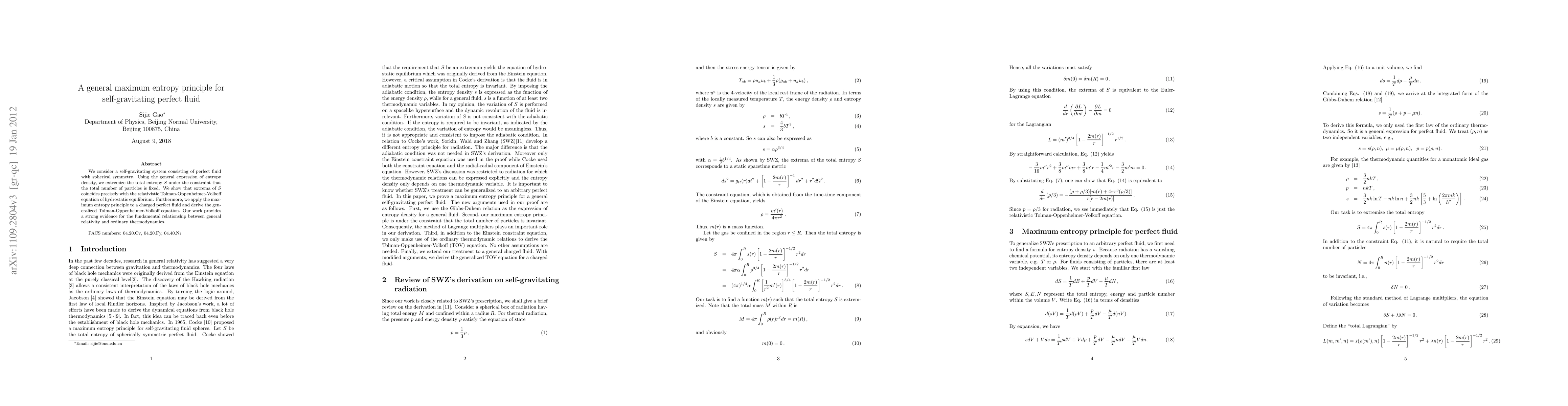 This paper demonstrates that extremizing the total entropy of a self-gravitating perfect fluid under particle number constraints leads to the relativistic Tolman-Oppenheimer-Volkoff equation, establishing a link between general relativity and thermodynamics. It also extends this principle to charged fluids, deriving a generalized TOV equation.