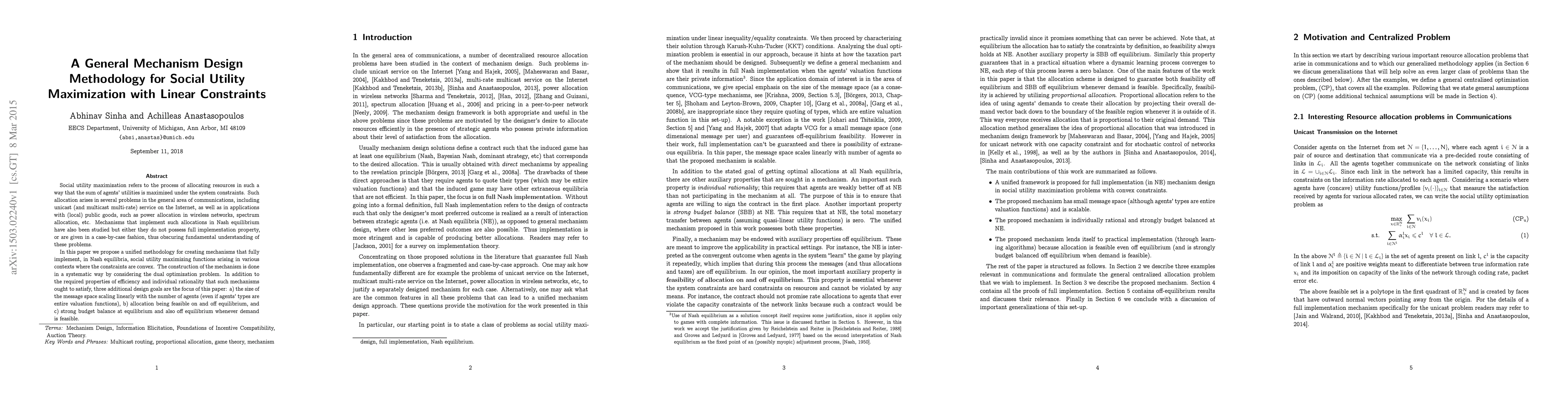 Social utility maximization refers to the process of allocating resources in such a way that the sum of agents' utilities is maximized under the system constraints. Such allocation arises in several problems in the general area of communications, including unicast (and multicast multi-rate) service on the Internet, as well as in applications with (local) public goods, such as power allocation in wireless networks, spectrum allocation, etc. Mechanisms that implement such allocations in Nash equilibrium have also been studied but either they do not possess full implementation property, or are given in a case-by-case fashion, thus obscuring fundamental understanding of these problems. In this paper we propose a unified methodology for creating mechanisms that fully implement, in Nash equilibria, social utility maximizing functions arising in various contexts where the constraints are convex. The construction of the mechanism is done in a systematic way by considering the dual optimization problem. In addition to the required properties of efficiency and individual rationality that such mechanisms ought to satisfy, three additional design goals are the focus of this paper: a) the size of the message space scaling linearly with the number of agents (even if agents' types are entire valuation functions), b) allocation being feasible on and off equilibrium, and c) strong budget balance at equilibrium and also off equilibrium whenever demand is feasible.