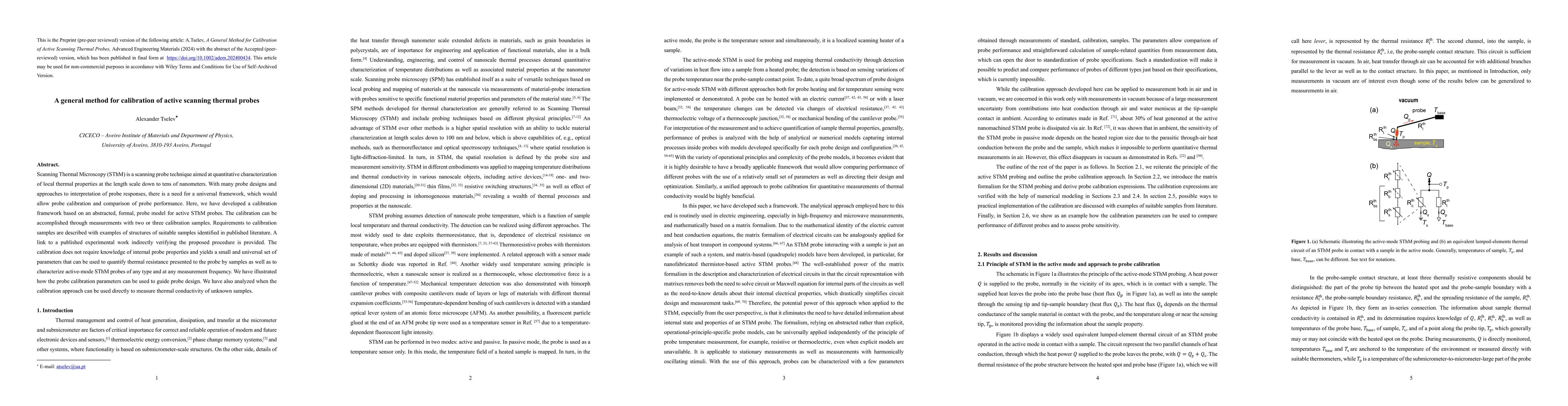 This paper presents a universal calibration method for active scanning thermal probes (SThM) using a formal probe model, which requires measurements from two or three calibration samples. The method allows characterization of thermal resistance and probe performance without needing internal probe properties, and can guide probe design and potentially measure thermal conductivity of unknown samples.