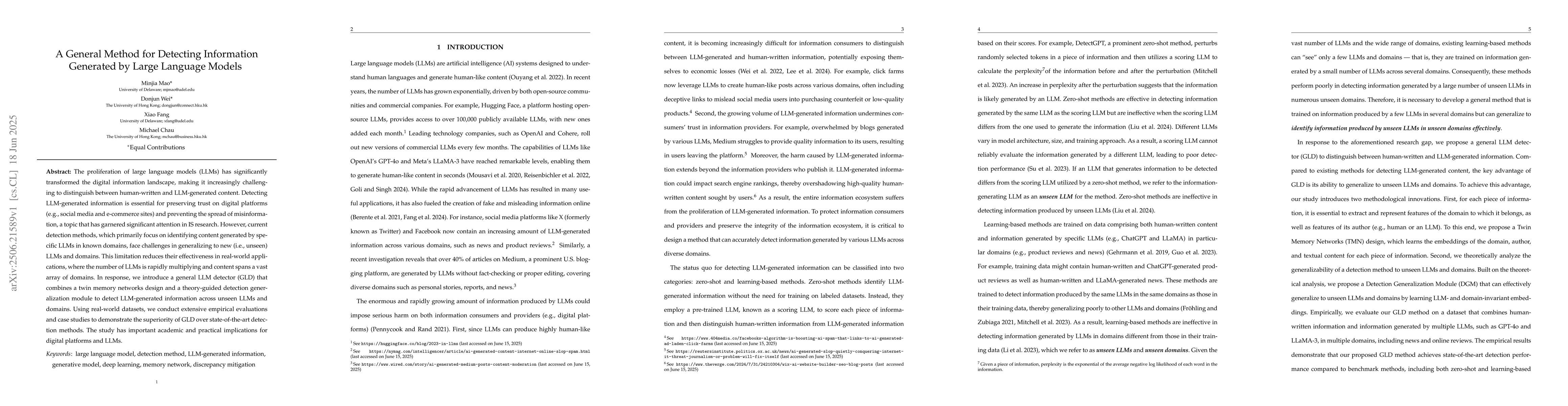 The paper proposes GLD, a general method for detecting information generated by large language models (LLMs), utilizing twin memory networks and a detection generalization module to generalize across unseen LLMs and domains.