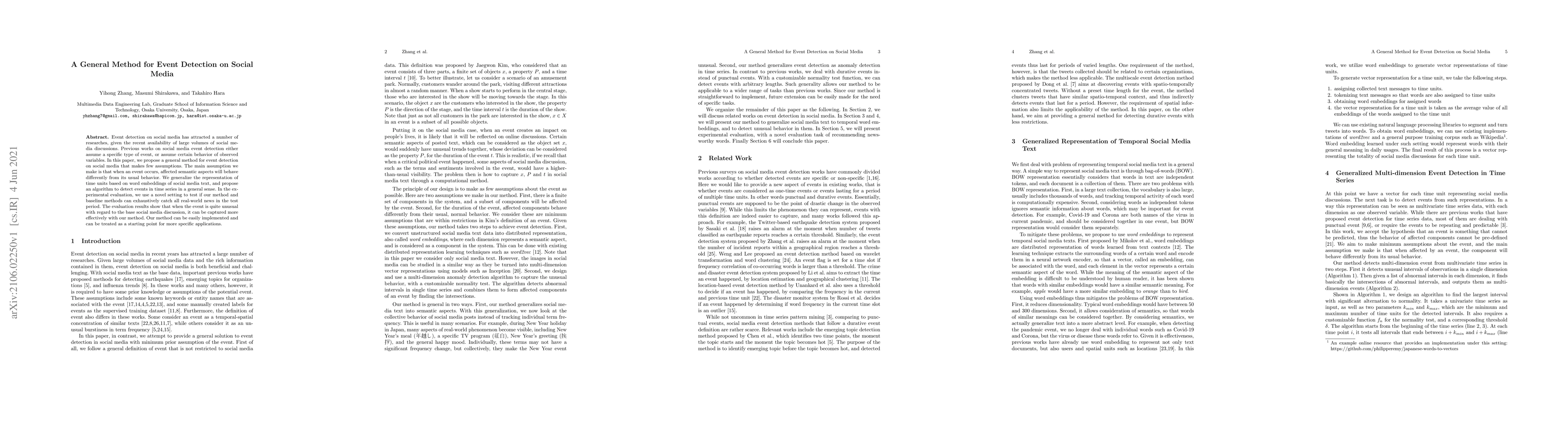 This paper introduces a general method for detecting events on social media with minimal assumptions, focusing on changes in affected semantic aspects. The proposed algorithm effectively captures unusual events by generalizing time units via word embeddings, outperforming baseline methods in experimental evaluations.