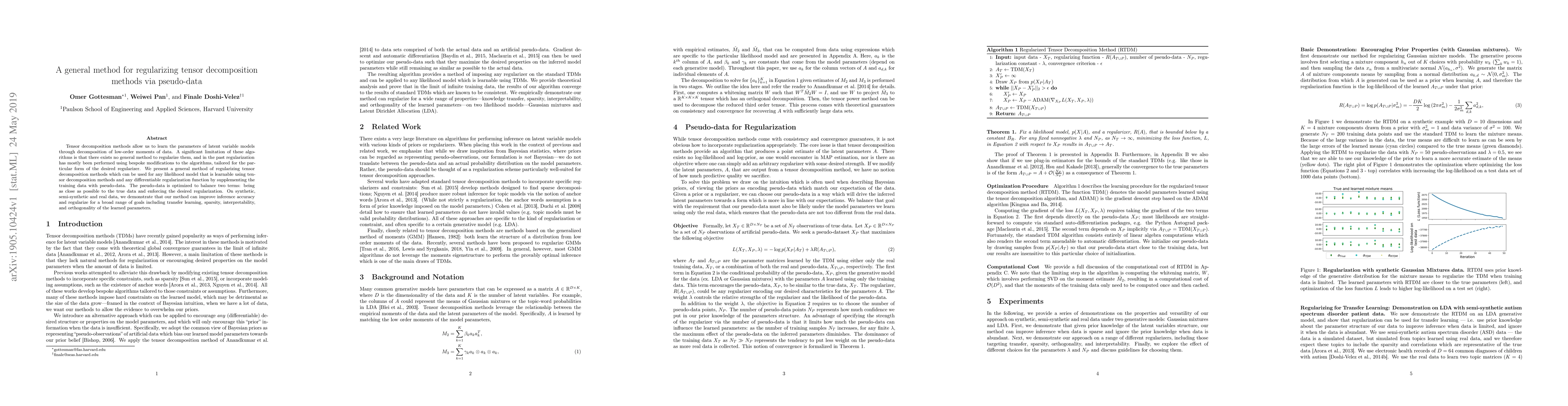 Tensor decomposition methods allow us to learn the parameters of latent variable models through decomposition of low-order moments of data. A significant limitation of these algorithms is that there exists no general method to regularize them, and in the past regularization has mostly been performed using bespoke modifications to the algorithms, tailored for the particular form of the desired regularizer. We present a general method of regularizing tensor decomposition methods which can be used for any likelihood model that is learnable using tensor decomposition methods and any differentiable regularization function by supplementing the training data with pseudo-data. The pseudo-data is optimized to balance two terms: being as close as possible to the true data and enforcing the desired regularization. On synthetic, semi-synthetic and real data, we demonstrate that our method can improve inference accuracy and regularize for a broad range of goals including transfer learning, sparsity, interpretability, and orthogonality of the learned parameters.