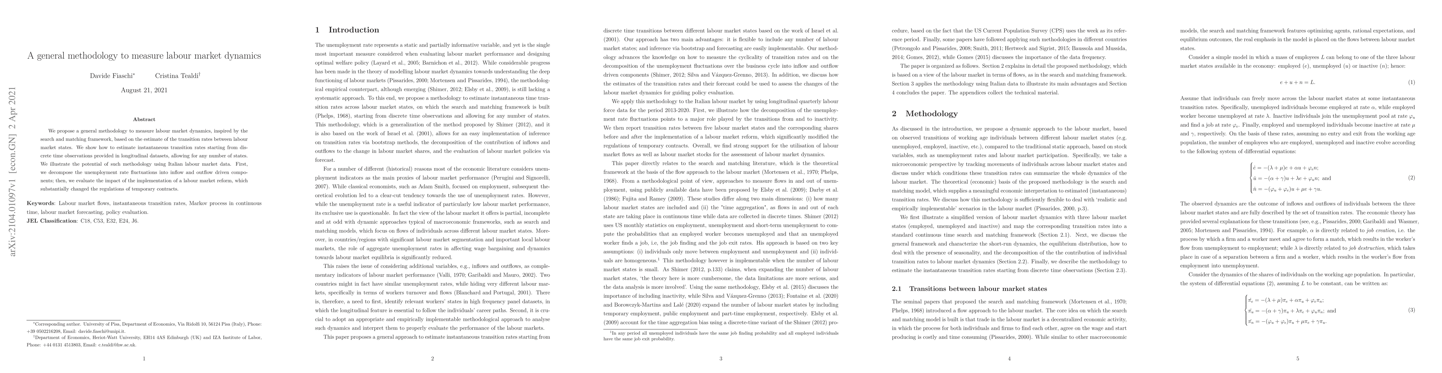 This paper introduces a methodology to measure labour market dynamics through transition rates between states, estimating instantaneous rates from longitudinal data. It applies this approach to Italian labour market data, decomposing unemployment fluctuations and assessing the impact of a labour market reform on temporary contracts.