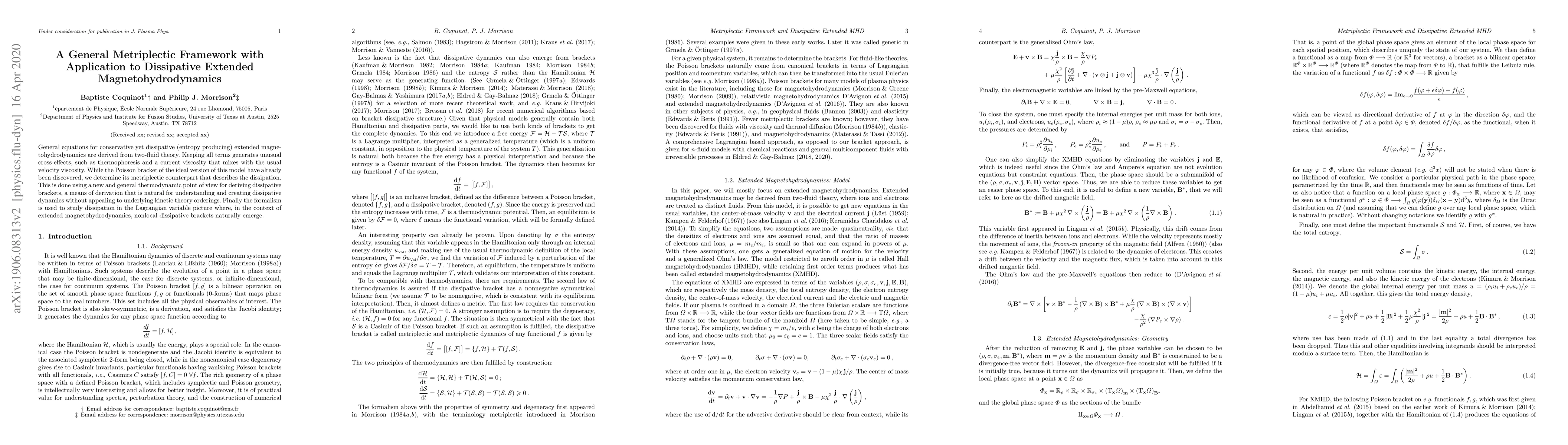 General equations for conservative yet dissipative (entropy producing) extended magnetohydrodynamics are derived from two-fluid theory. Keeping all terms generates unusual cross-effects, such as thermophoresis and a current viscosity that mixes with the usual velocity viscosity. While the Poisson bracket of the ideal version of this model have already been discovered, we determine its metriplectic counterpart that describes the dissipation. This is done using a new and general thermodynamic point of view for deriving dissipative brackets, a means of derivation that is natural for understanding and creating dissipative brackets. Finally the formalism is used to study dissipation in the Lagrangian variable picture where, in the context of extended magnetohydrodynamics, nonlocal dissipative brackets naturally emerge.