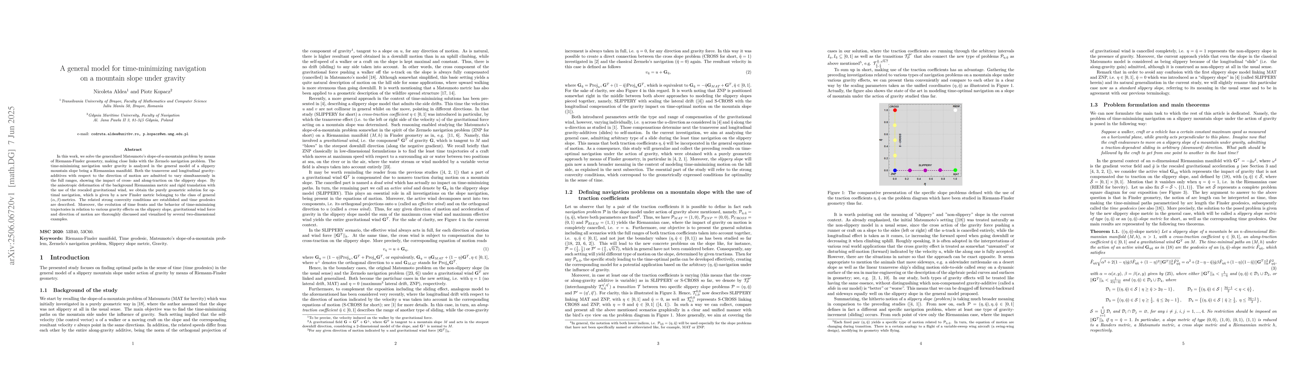 This research paper develops a general model for time-minimizing navigation on a slippery mountain slope under gravity, using Riemann-Finsler geometry to analyze the impact of cross- and along-traction on optimal navigation routes.