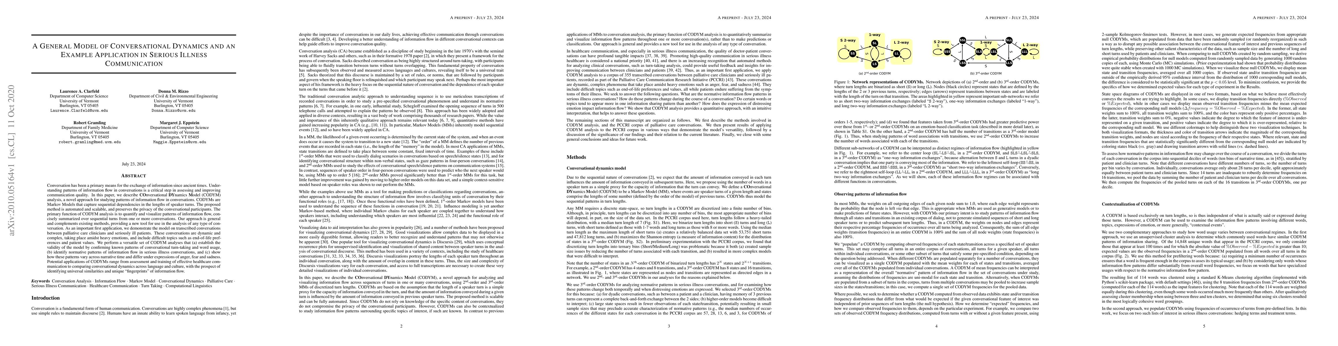 The research introduces COnversational DYnamics Models (CODYMs), Markov Models that capture sequential dependencies in speaker turn lengths, applied to transcribed conversations between palliative care clinicians and seriously ill patients.