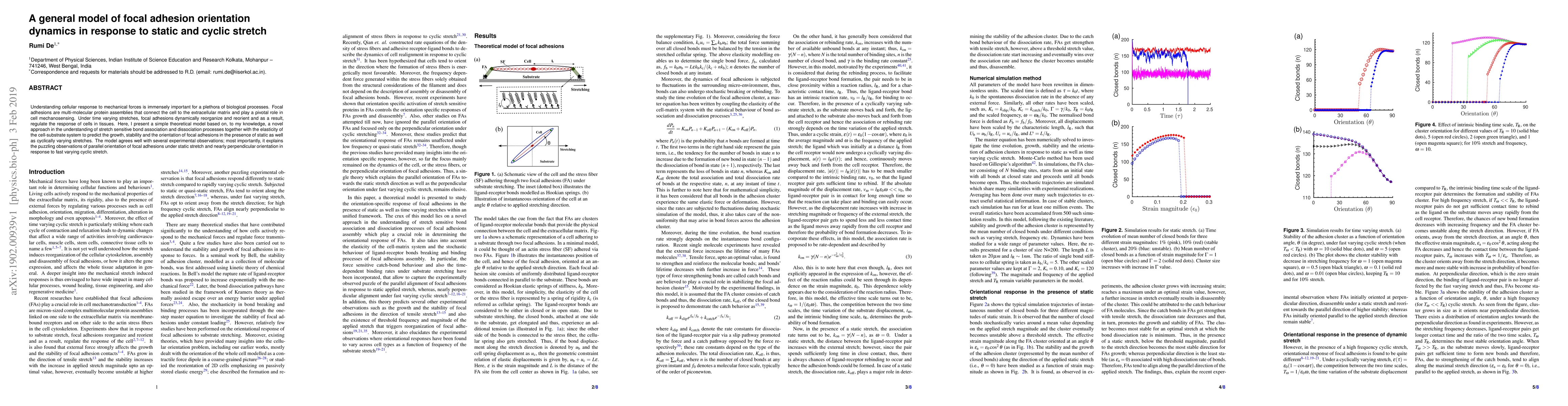 This paper presents a theoretical model to predict the dynamics of focal adhesion orientation under static and cyclic stretch, explaining the reorganization of these adhesions in response to mechanical forces. The model successfully predicts the observed parallel orientation under static stretch and perpendicular orientation under cyclic stretch, aligning well with experimental observations.