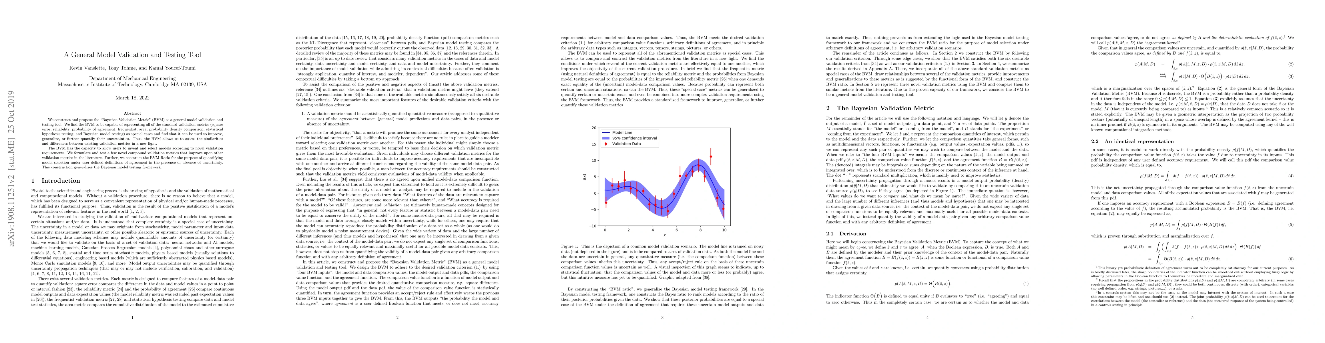 The research constructs the Bayesian Validation Metric (BVM) as a general model validation and testing tool, capable of representing standard validation metrics as special cases and allowing for novel model selection under user-defined agreement criteria.