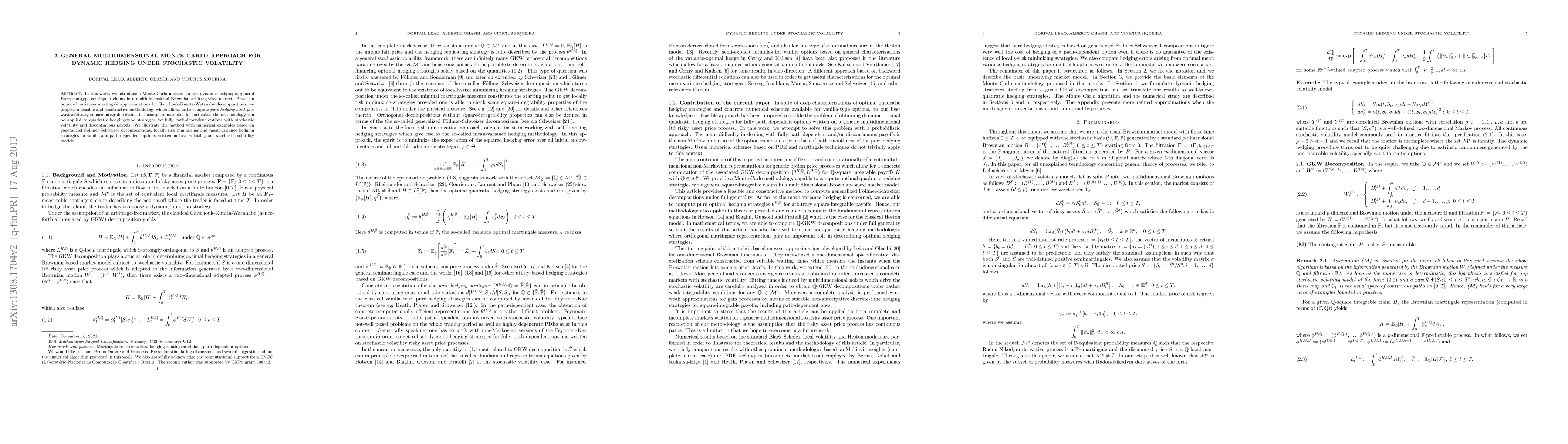 This paper presents a Monte Carlo method for dynamic hedging of European-type contingent claims in stochastic volatility markets, utilizing bounded variation martingale approximations and multidimensional decompositions to compute hedging strategies for path-dependent options. The methodology supports various hedging approaches and is demonstrated through numerical examples.