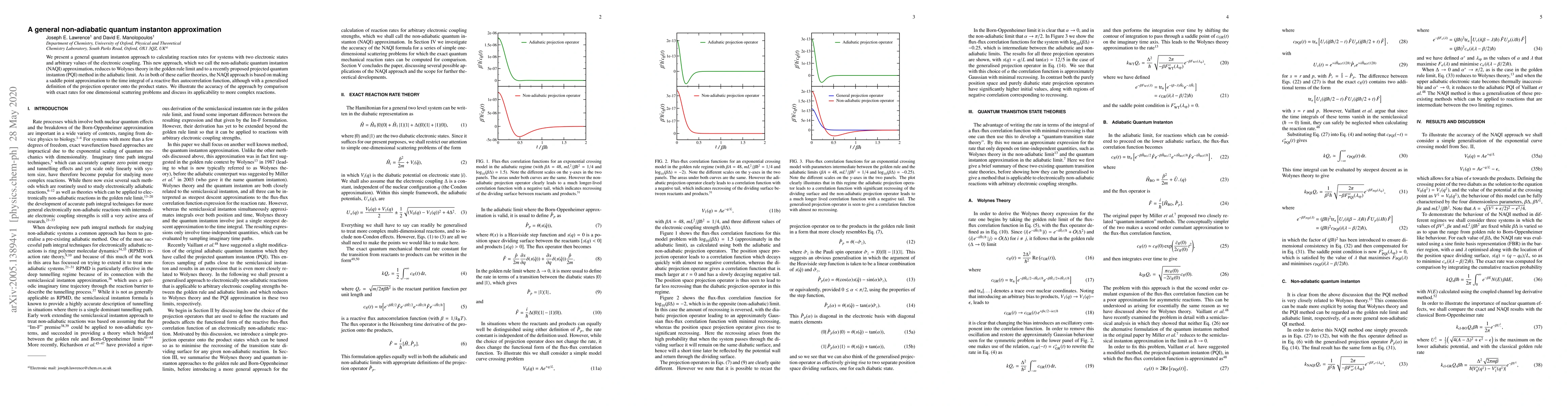This paper introduces the non-adiabatic quantum instanton (NAQI) approximation for calculating reaction rates in systems with two electronic states, generalizing earlier theories. The NAQI approach is validated against exact rates for one-dimensional scattering problems and is shown to be applicable to more complex reactions.