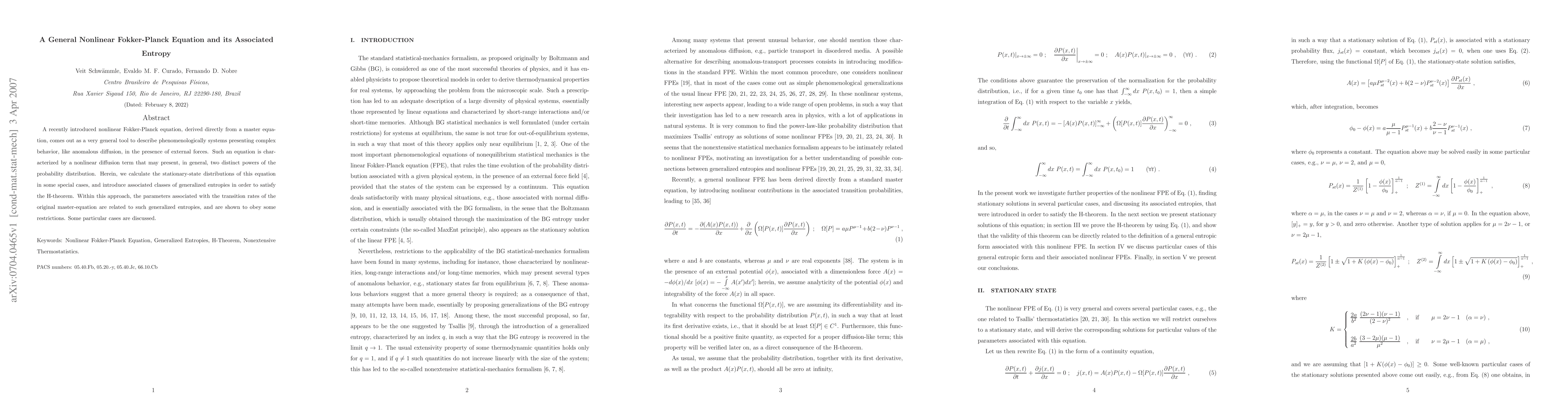 This paper introduces a general nonlinear Fokker-Planck equation to model complex systems exhibiting anomalous diffusion and external forces, featuring a nonlinear diffusion term. It calculates stationary-state distributions and introduces generalized entropies to satisfy the H-theorem, linking transition rate parameters to these entropies and showing they obey certain restrictions.