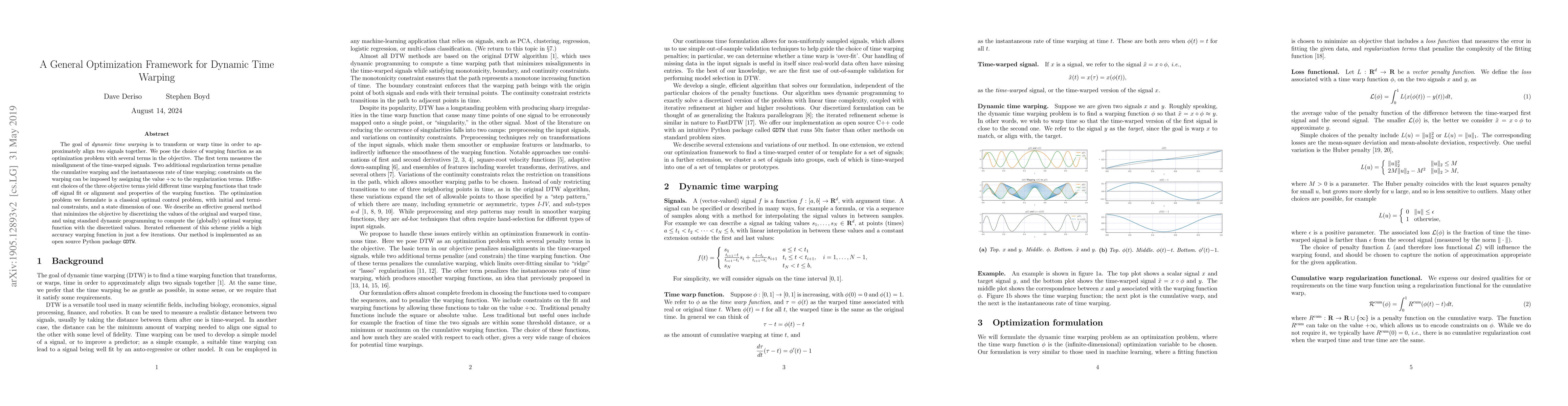 This paper presents an optimization framework for dynamic time warping (DTW) that aligns two signals by transforming time. The framework formulates DTW as an optimal control problem with terms for signal misalignment, cumulative warping, and instantaneous rate of warping, solved using dynamic programming with iterated refinement for high accuracy.