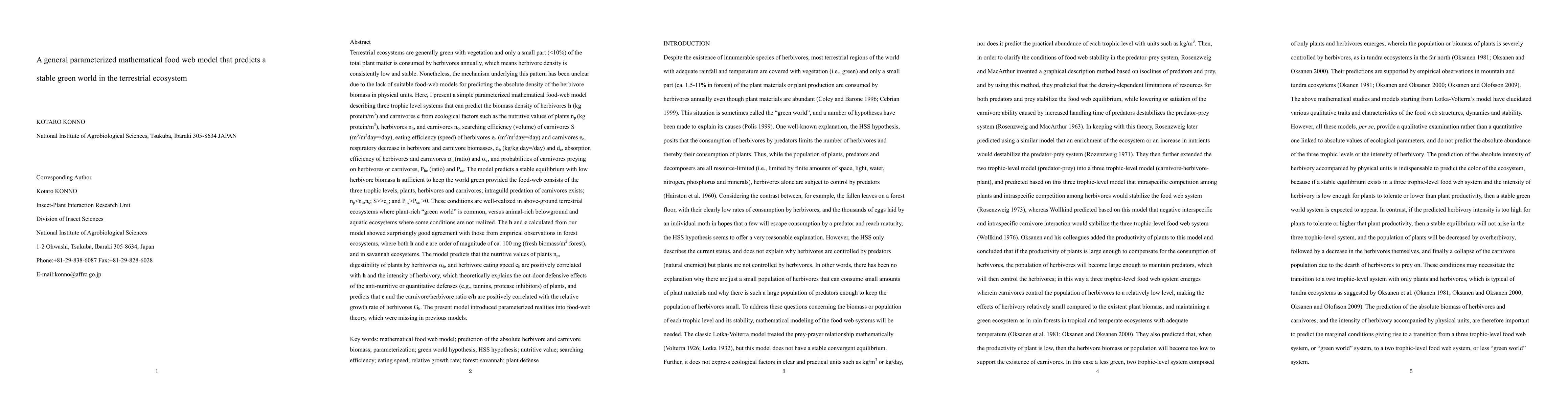 This paper presents a parameterized mathematical food web model that predicts low herbivore biomass in terrestrial ecosystems, maintaining a "green world" by incorporating ecological factors like plant nutritive values and predator-prey interactions. The model's predictions align with empirical observations and suggest that plant defenses correlate with herbivore pressure.