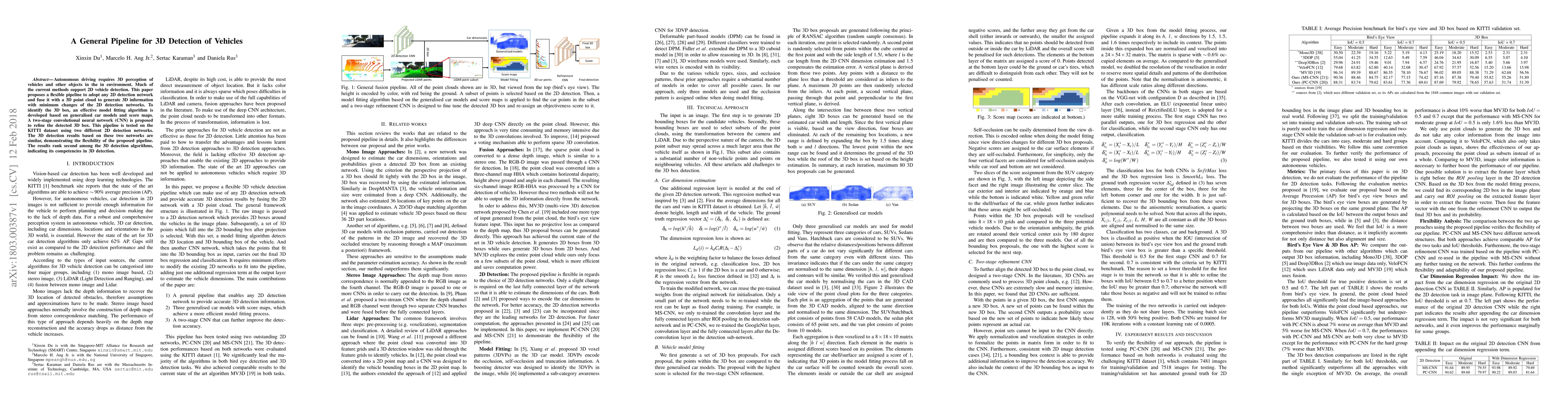 Autonomous driving requires 3D perception of vehicles and other objects in the in environment. Much of the current methods support 2D vehicle detection. This paper proposes a flexible pipeline to adopt any 2D detection network and fuse it with a 3D point cloud to generate 3D information with minimum changes of the 2D detection networks. To identify the 3D box, an effective model fitting algorithm is developed based on generalised car models and score maps. A two-stage convolutional neural network (CNN) is proposed to refine the detected 3D box. This pipeline is tested on the KITTI dataset using two different 2D detection networks. The 3D detection results based on these two networks are similar, demonstrating the flexibility of the proposed pipeline. The results rank second among the 3D detection algorithms, indicating its competencies in 3D detection.