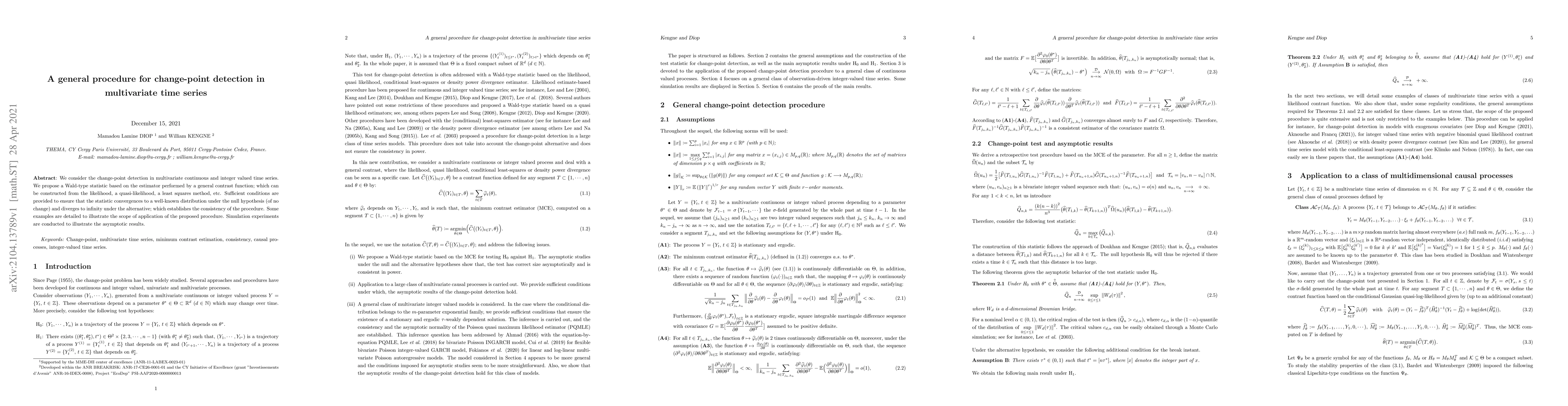 This paper proposes a Wald-type change-point detection procedure for multivariate time series, utilizing a general contrast function for estimation. The method is shown to be consistent and is demonstrated through simulations and examples.