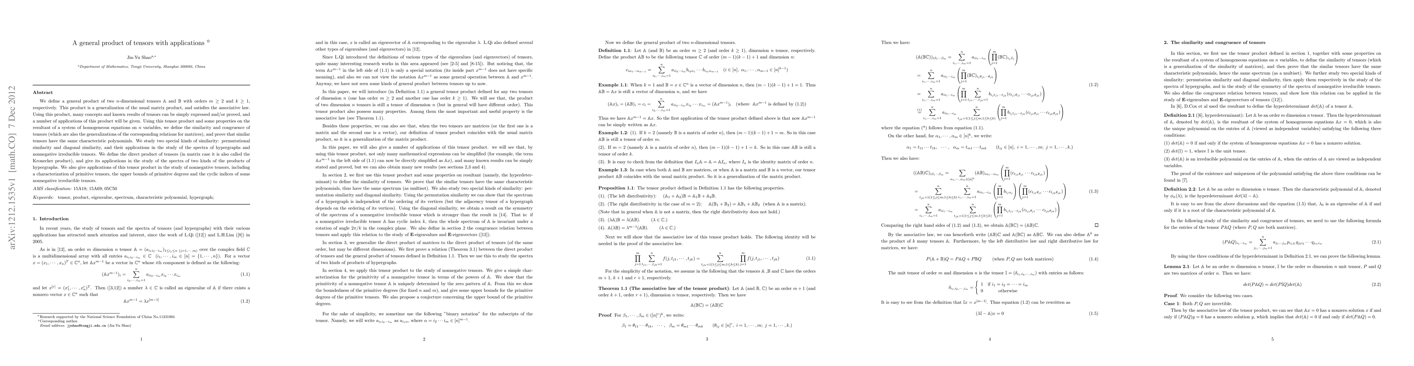 This paper introduces a general tensor product for $n$-dimensional tensors, extending the matrix product and satisfying the associative law. It explores applications in defining tensor similarity, congruence, and their implications for hypergraph spectra and nonnegative tensors, including primitive tensor characterization and bounds.