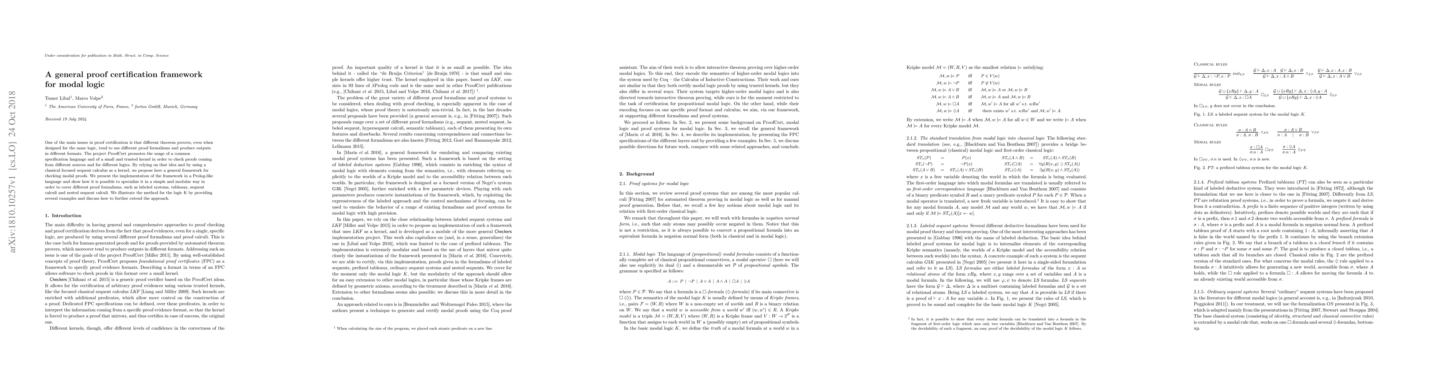 A framework for checking modal logic proofs using a common specification language and a trusted kernel is proposed to overcome differences in proof formalisms among theorem provers.