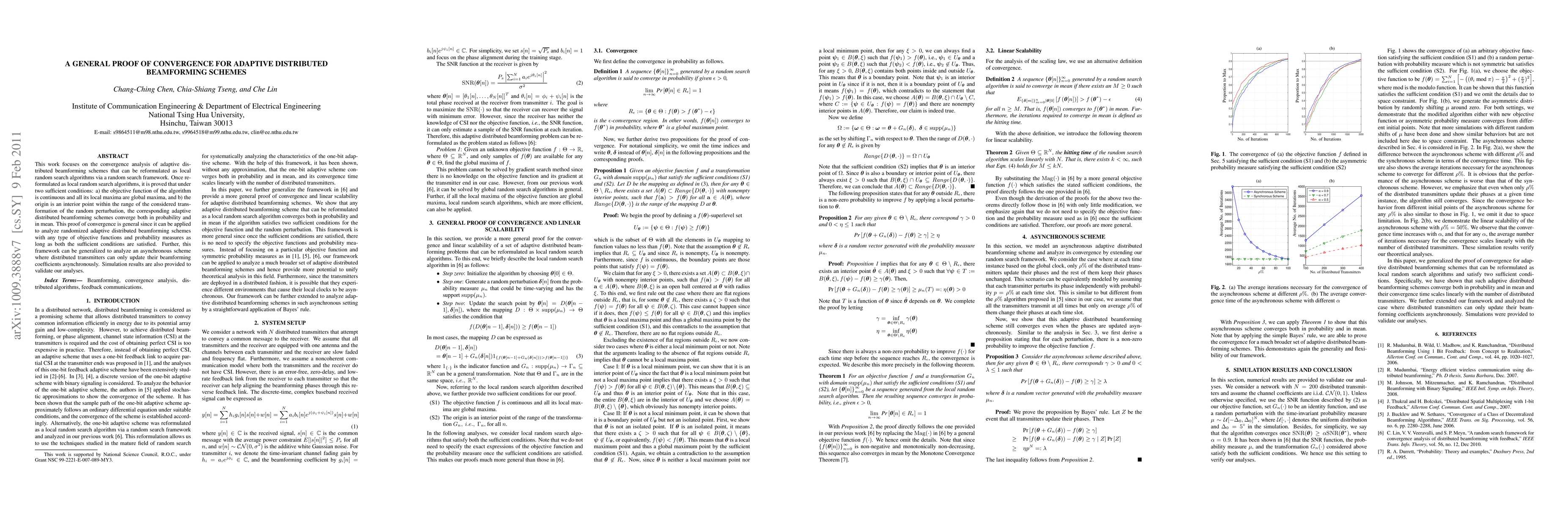 This paper proves the convergence of adaptive distributed beamforming schemes reformulated as local random search algorithms under two conditions: continuity of the objective function and the origin being an interior point. The proof is general and applicable to various objective functions and probability measures, and it extends to asynchronous updates. Simulation results are provided to validate the theoretical findings.