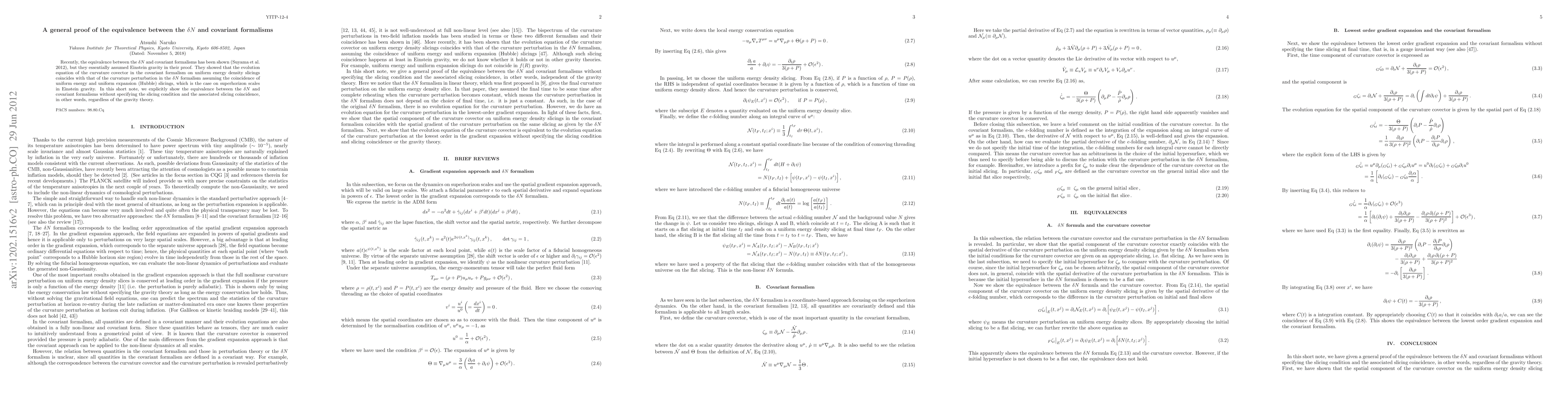 This paper provides a general proof demonstrating the equivalence between the δN and covariant formalisms for cosmological perturbations, extending beyond the assumptions of Einstein gravity and without requiring specific slicing conditions. The authors show that the evolution equations for curvature perturbations align across these formalisms irrespective of the underlying gravity theory.