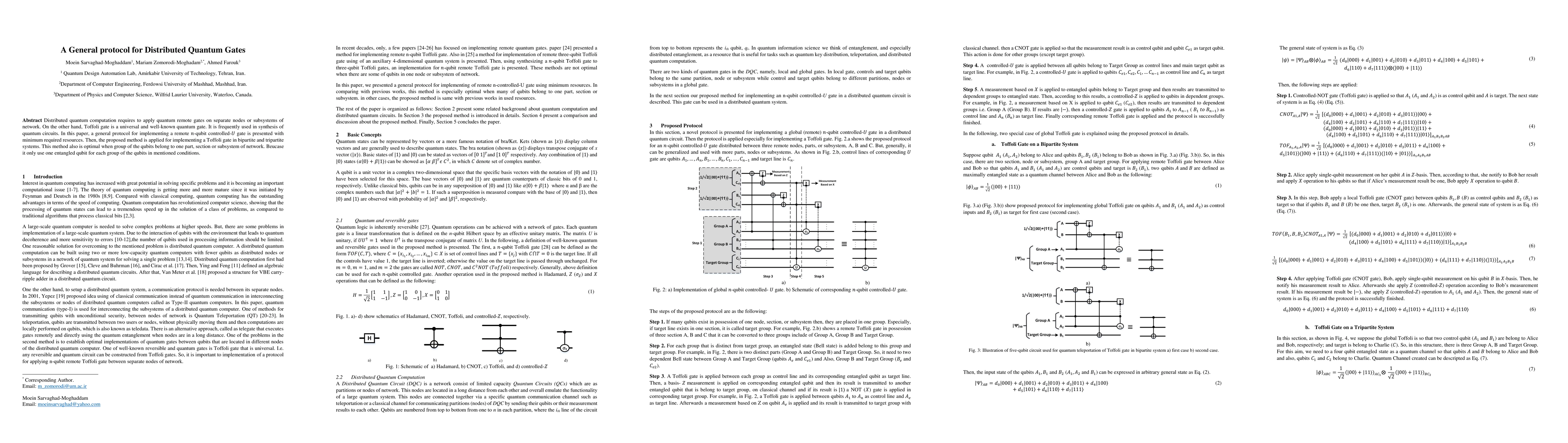 Distributed quantum computation requires to apply quantum remote gates on separate nodes or subsystems of network. On the other hand, Toffoli gate is a universal and well-known quantum gate. It is frequently used in synthesis of quantum circuits. In this paper, a general protocol for implementing a remote n-qubit controlled-U gate is presented with minimum required resources. Then, the proposed method is applied for implementing a Toffoli gate in bipartite and tripartite systems. This method also is optimal when group of the qubits belong to one part, section or subsystem of network. Because it only use one entangled qubit for each group of the qubits in mentioned conditions.