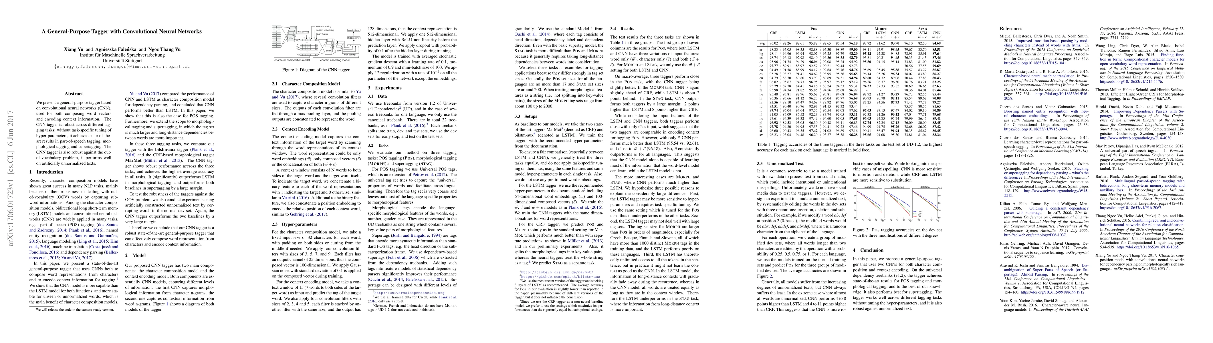 This paper introduces a versatile tagger based on convolutional neural networks (CNN) that excels in part-of-speech, morphological, and supertagging tasks without task-specific tuning, demonstrating robustness against the out-of-vocabulary issue and unnormalized text.