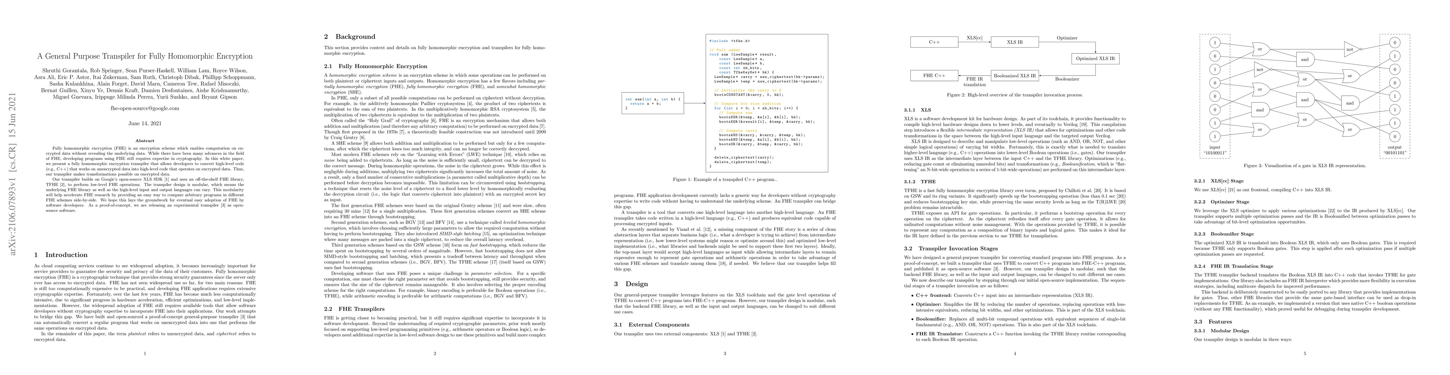 This paper presents a transpiler that enables developers to convert high-level code into encrypted data processing code using fully homomorphic encryption (FHE). The modular transpiler leverages Google's XLS SDK and TFHE library, aiming to simplify the adoption of FHE in software development.