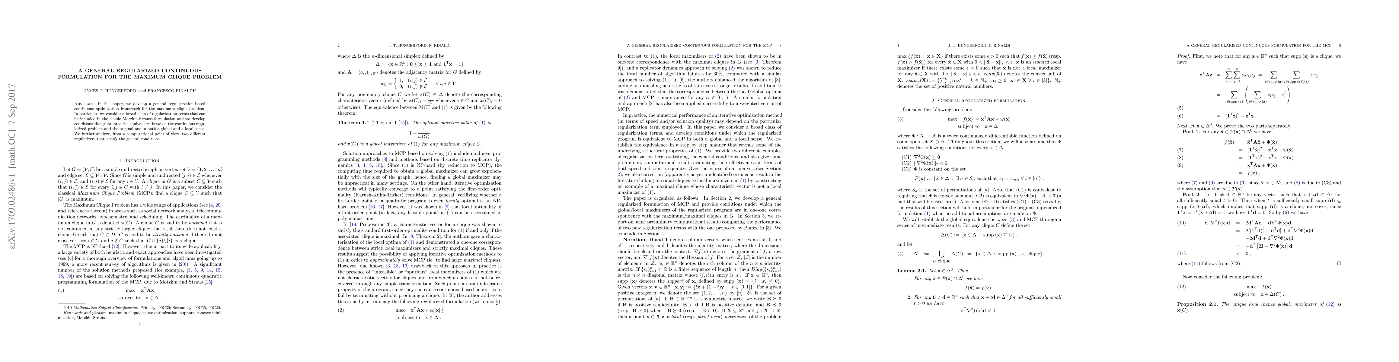 This paper introduces a general continuous optimization framework for solving the maximum clique problem using regularization. It establishes conditions ensuring equivalence between the regularized continuous formulation and the original discrete problem, and computationally analyzes two specific regularizers.
