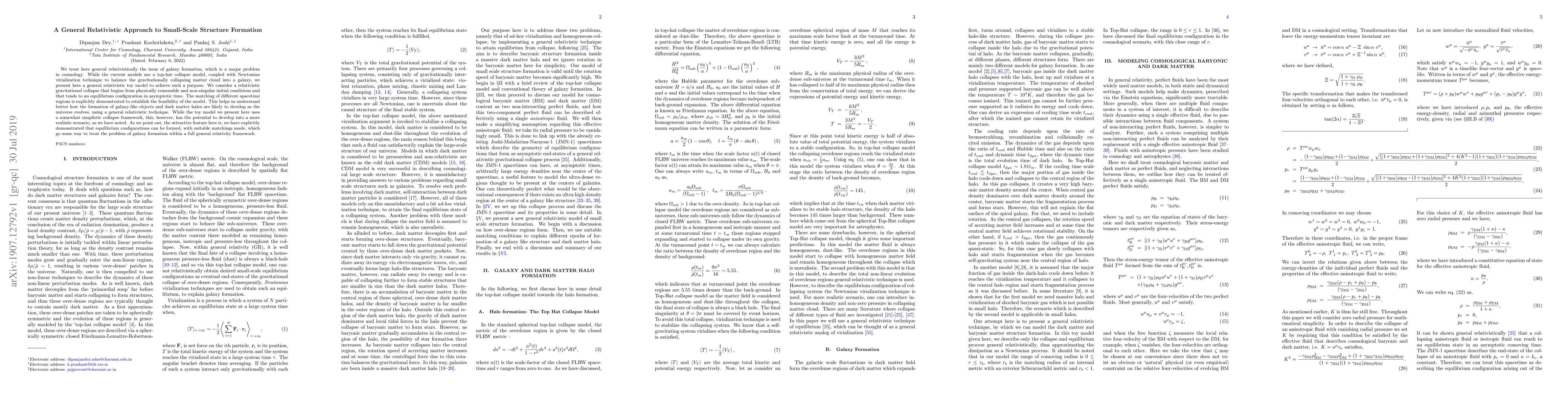 This paper presents a general relativistic toy model for galaxy formation, moving beyond Newtonian models to explore how galaxy-like structures and dark matter halos develop in a universe governed by general relativity. The model demonstrates feasible matching of spacetime regions to form equilibrium configurations, suggesting potential for a more realistic approach to small-scale structure formation.
