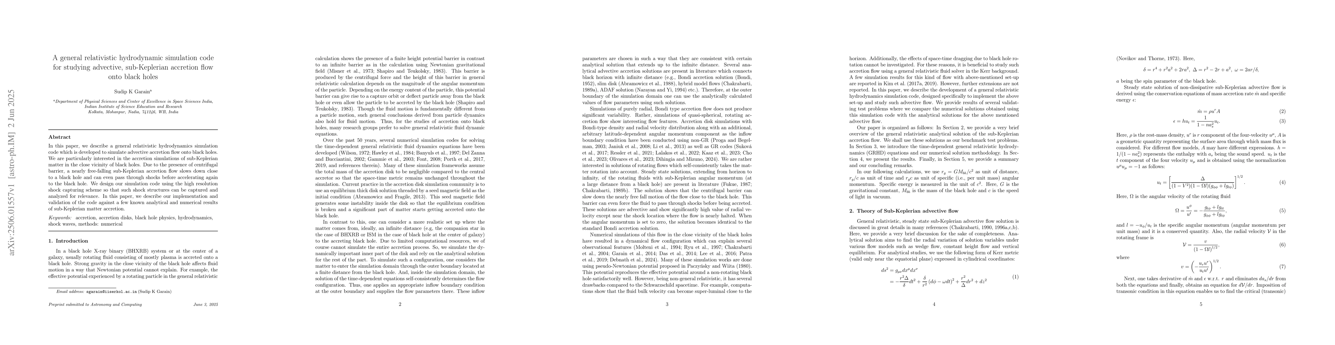 A new computer simulation code was created to study how matter flows into black holes, with a focus on slow-moving, spinning material that can create powerful shocks as it approaches the event horizon.