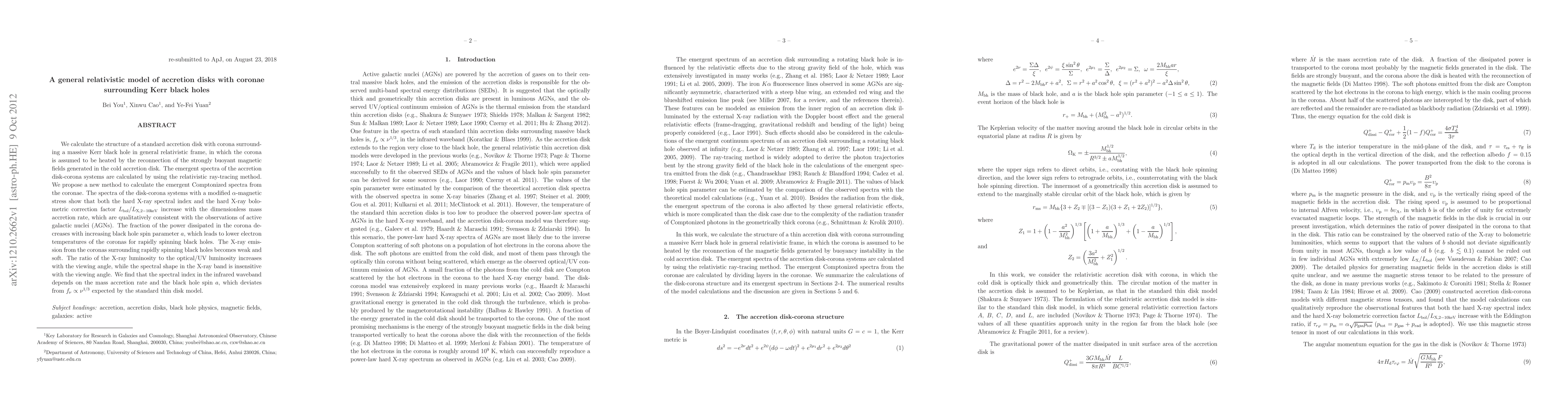 This paper develops a general relativistic model for accretion disks with coronae surrounding Kerr black holes, showing that the hard X-ray spectral index and bolometric correction factor increase with mass accretion rate, consistent with AGN observations. The study finds that rapidly spinning black holes have weaker and softer X-ray emissions due to lower corona electron temperatures.